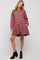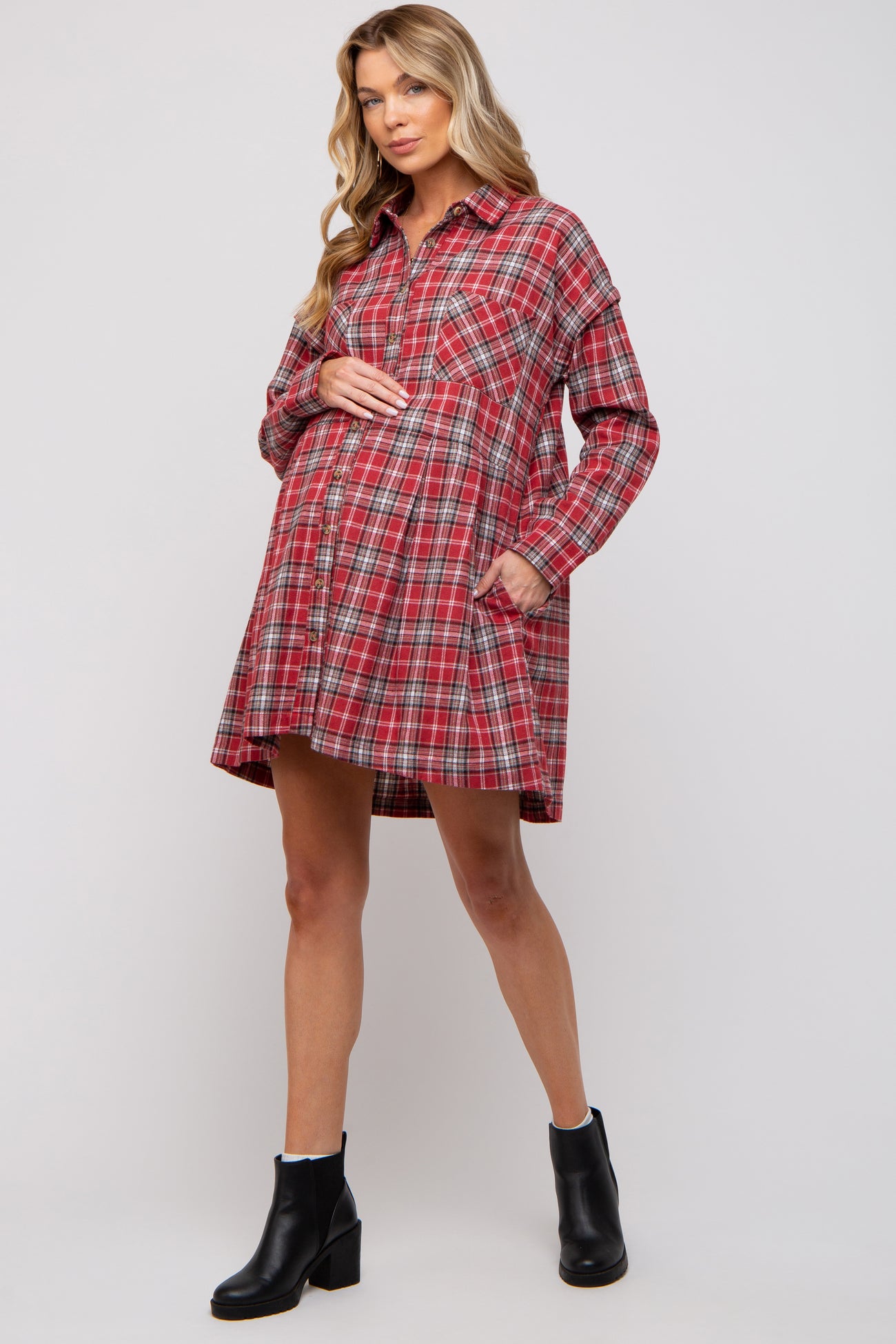 Burgundy Plaid Button Front Long Sleeve Maternity Dress