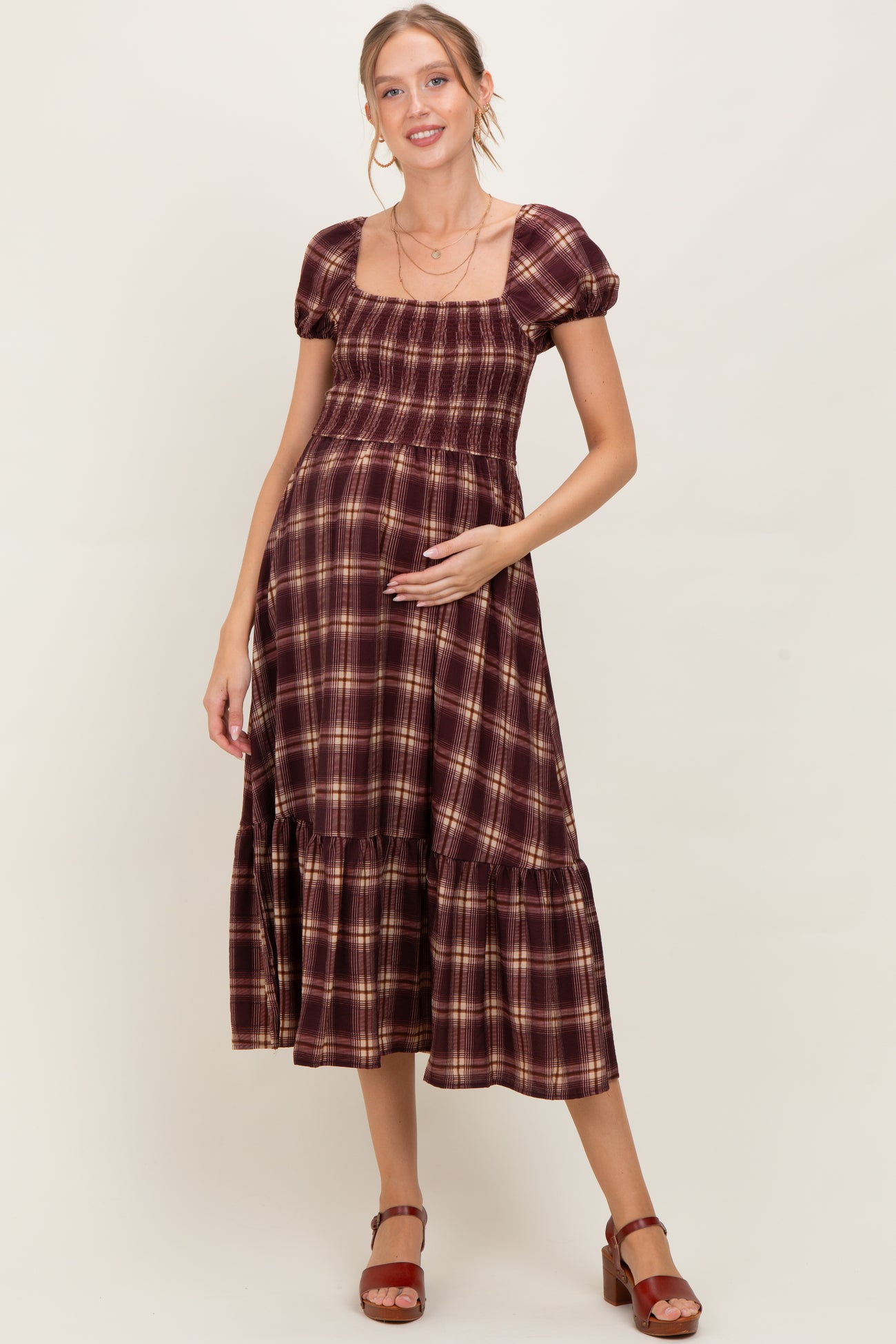 Burgundy Plaid Smocked Puff Sleeve Maternity Midi Dress