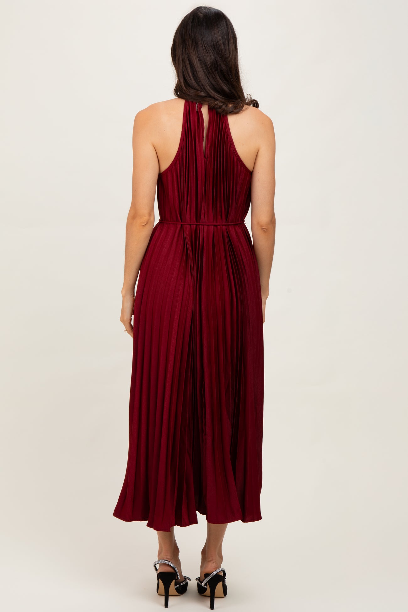Elevate your style with our Burgundy Pleated Halter Dress, perfect for any special occasion. Crafted from lightweight, flowy fabric, this dress features elegant pleats and a flattering halter neckline that highlights your shoulders. The adjustable waist tie accentuates your silhouette while ensuring a comfortable fit. Its midi length offers a timeless, sophisticated look. Pair it with heels and a chic clutch for effortless glam. Whether it’s a wedding, cocktail party, or evening event, this dress is your go-to for a polished, graceful appearance. Available in all sizes.