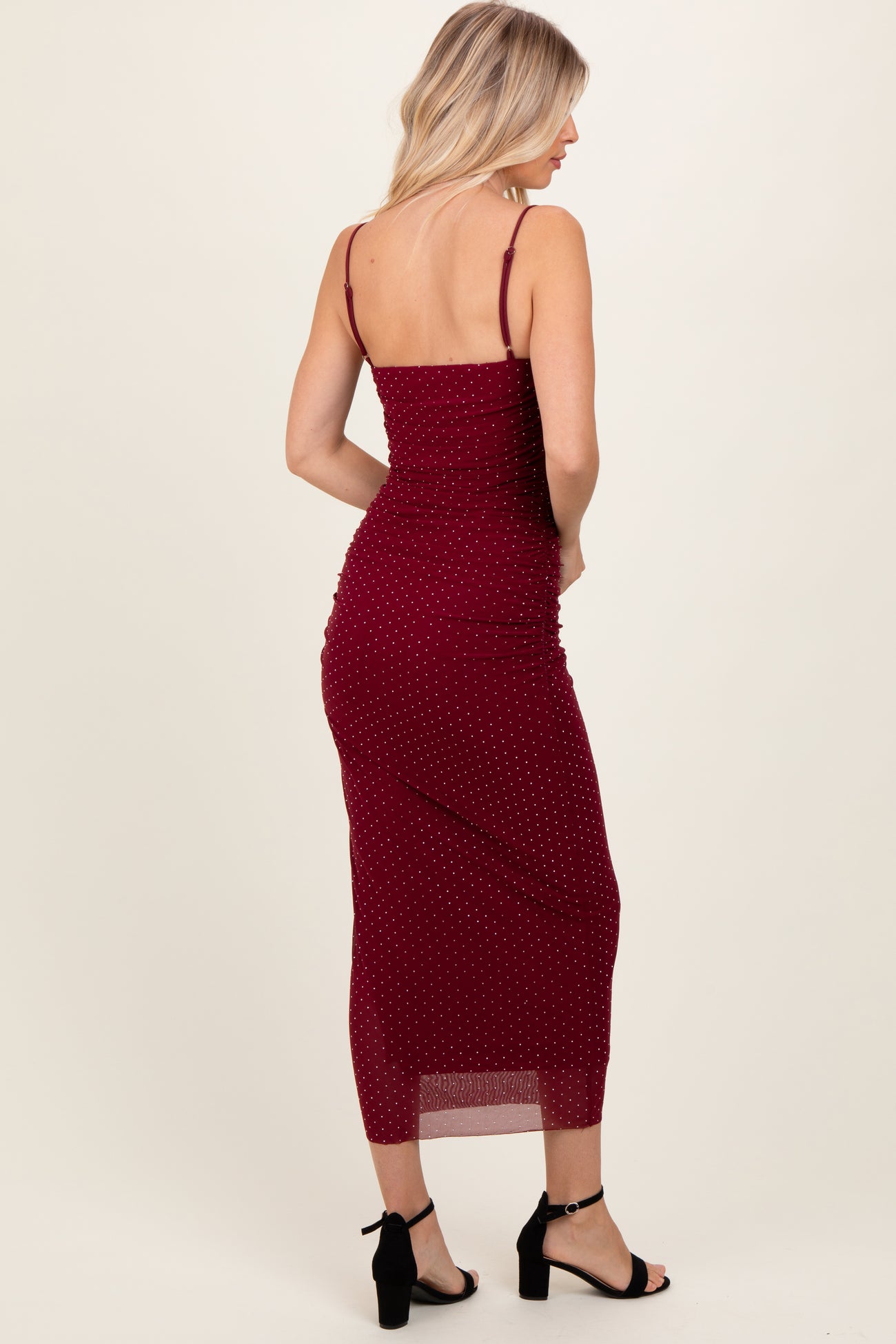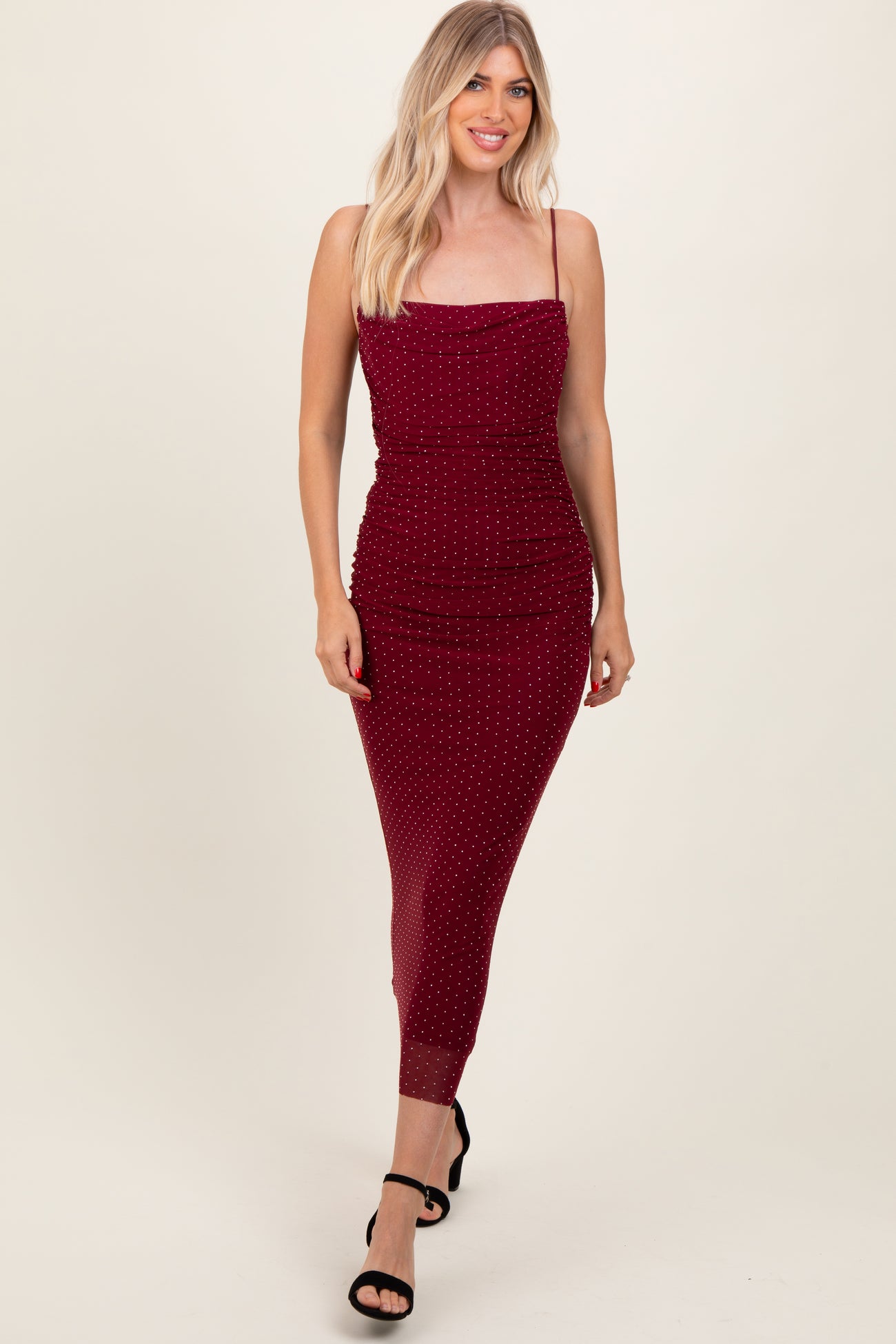 Burgundy Rhinestone Fitted Ruched Maxi Dress