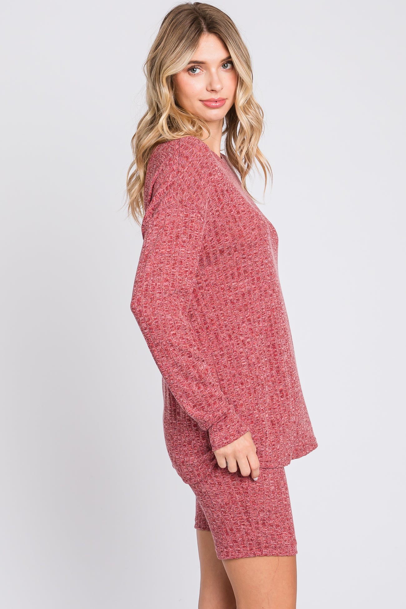 A heathered ribbed set. Top features long sleeves and a rounded neckline. Fitted shorts.