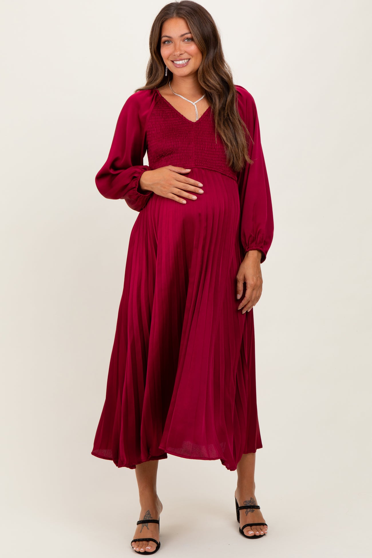 Burgundy Satin Smocked Pleated Maternity Midi Dress