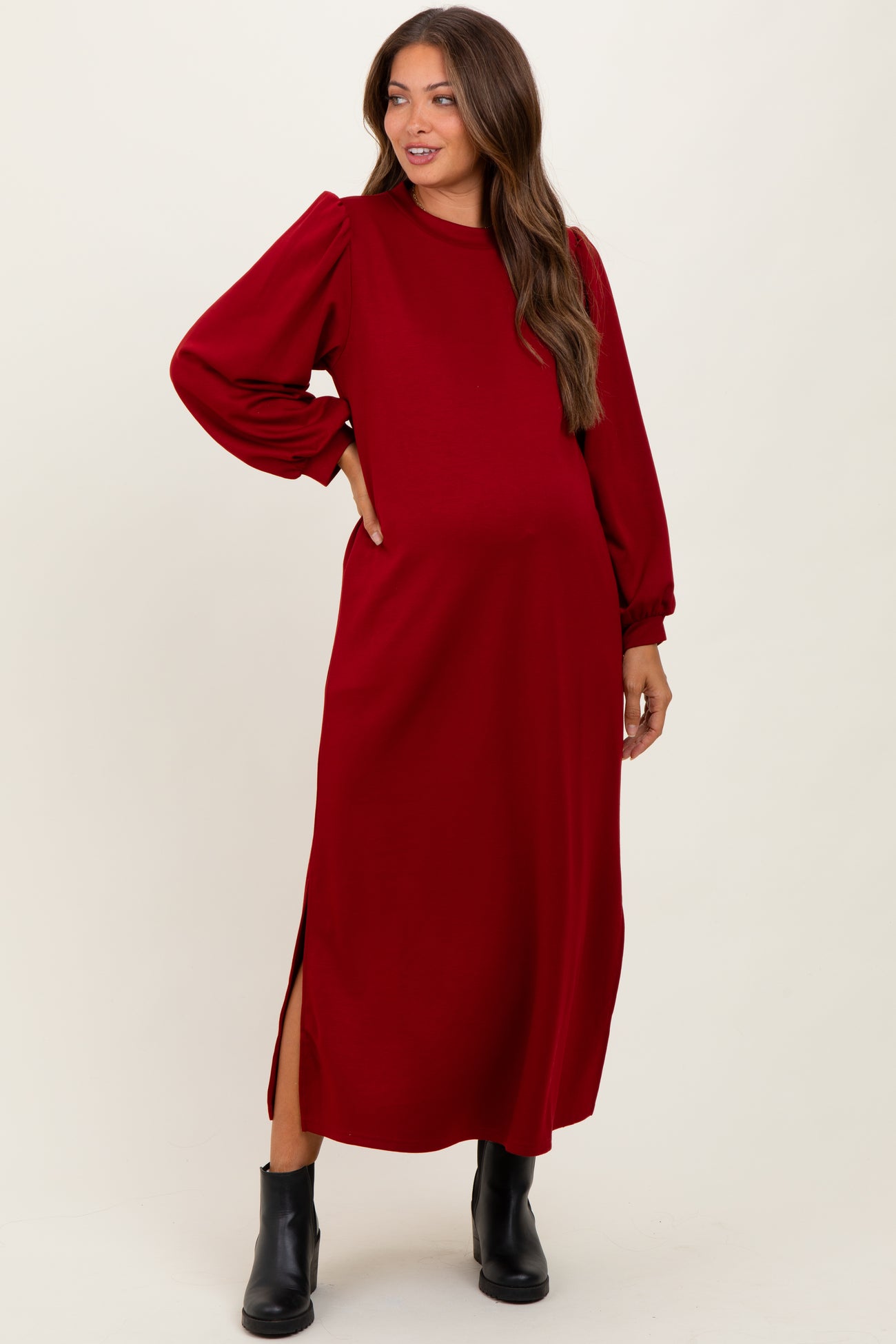 Burgundy Side Slit Detail Solid Maternity Midi Dress