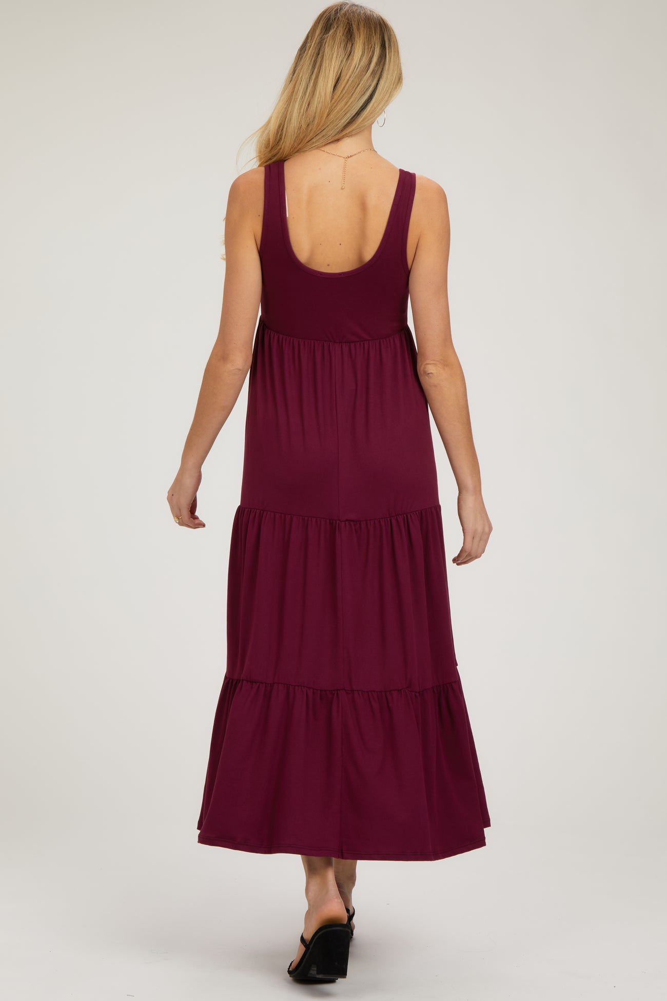 Burgundy Sleeveless Scoop Back Tiered Maternity Maxi Dress