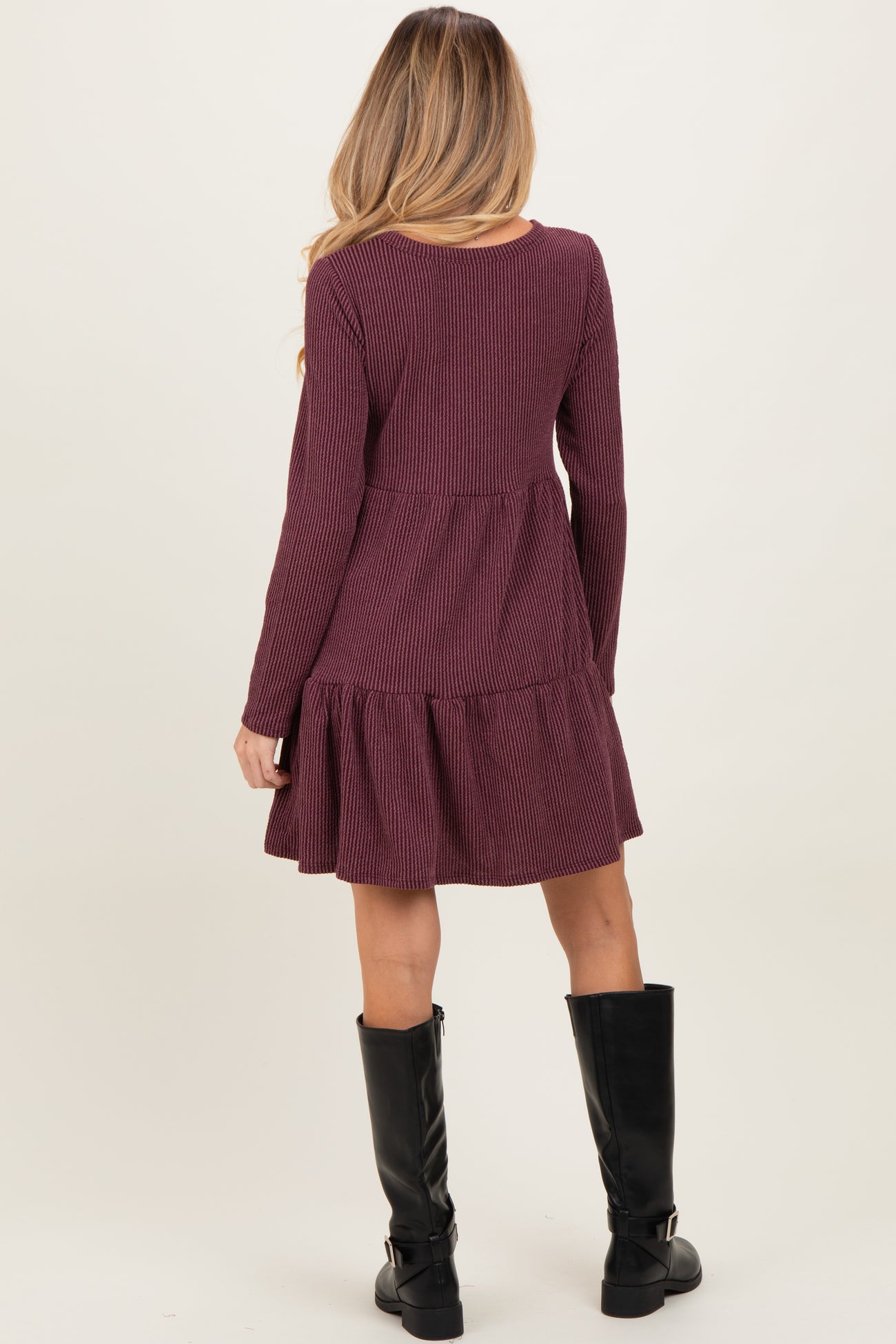 Burgundy Textured Rib Tiered Long Sleeve Maternity Dress