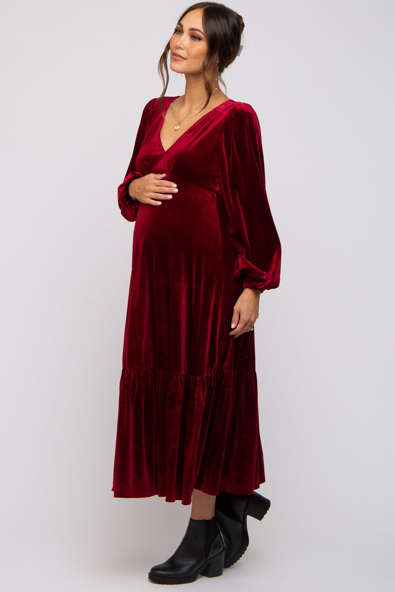 A velvet knit maternity midi dress featuring a v-neckline, long puff sleeves, a v-neckline a ruffle hem, a back zipper and double lining.