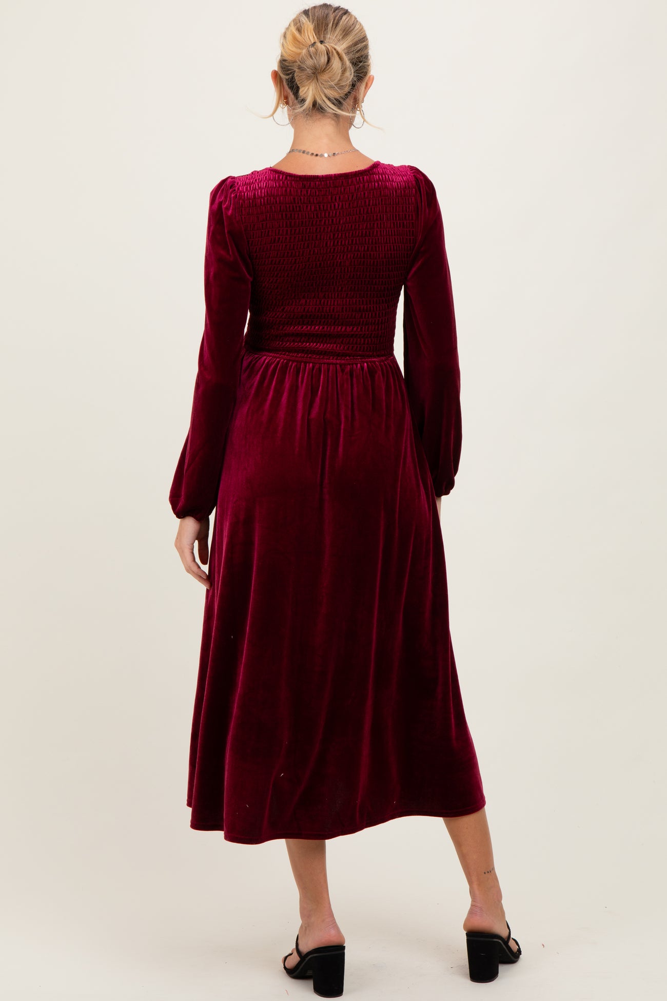 Burgundy Velvet Smocked Long Sleeve Maternity Midi Dress