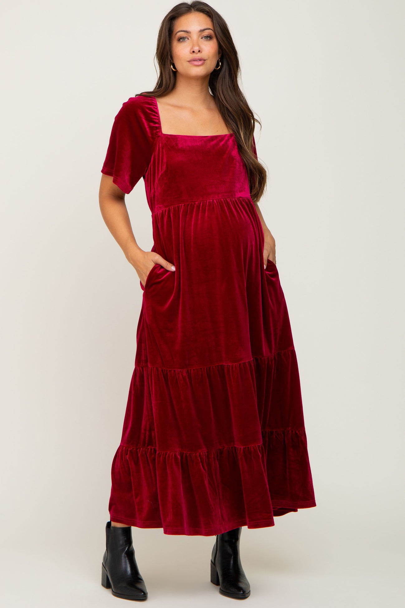 A velvet maternity maxi dress featuring short sleeves, a tiered body, back smocking and a square neckline.