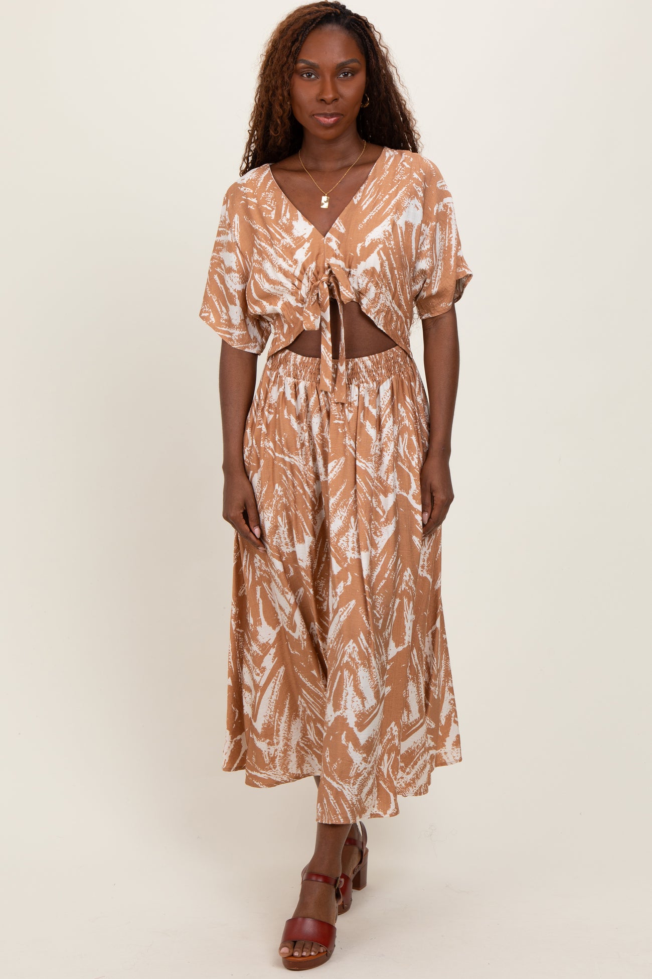 Camel Brushstroke Print Cutout Maternity Midi Dress