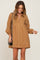 A solid hue dress featuring long raglan sleeves, a collar, functioning front buttons, and side pockets. Dress is lined for coverage.