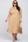 A soft knit plus size midi dress featuring a half button up v-neckline, short, rolled sleeves and a rounded hem with side slits.