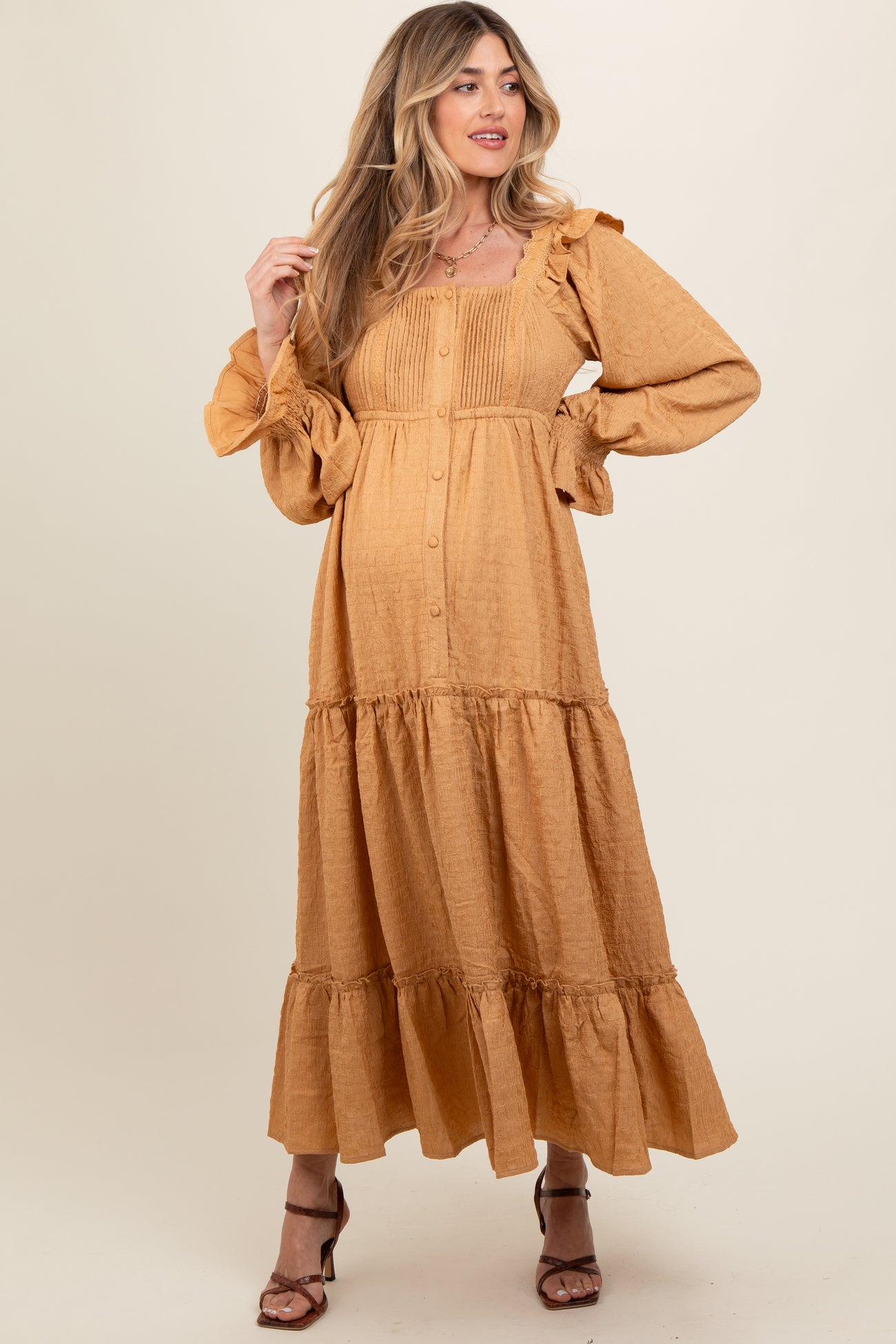Camel Button Pleated Front Square Neck Ruffle Tiered Maternity Maxi Dress