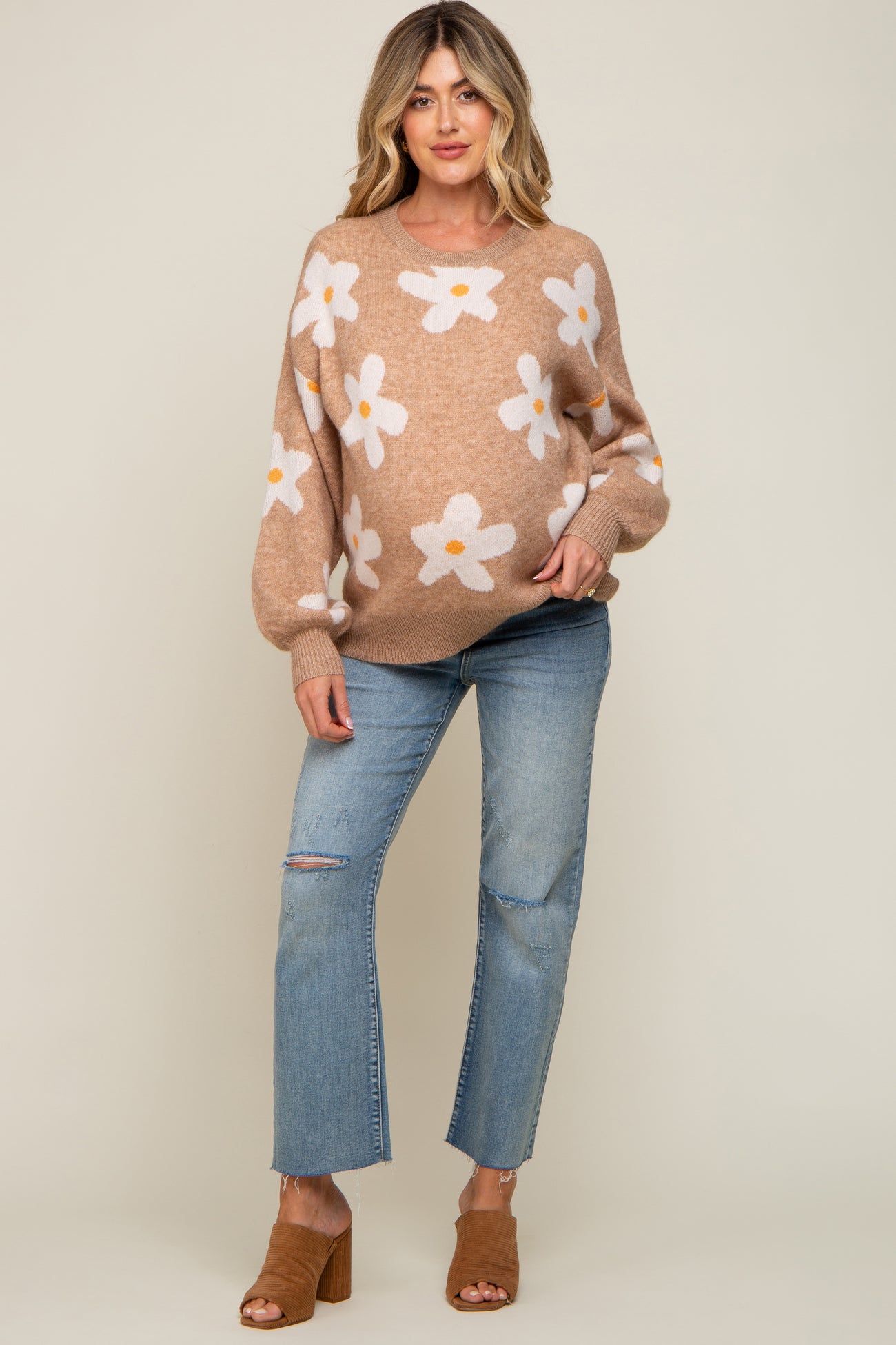 A daisy print maternity sweater featuring a crew neckline and long puff sleeves.