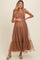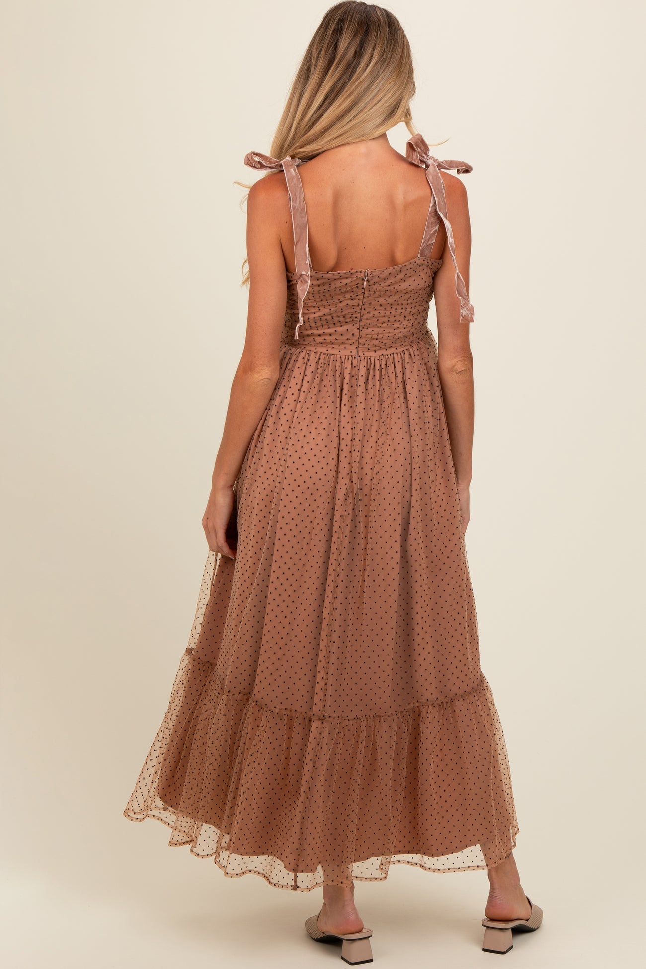 Camel Dotted Mesh Overlay Shoulder Tie Maternity Midi Dress