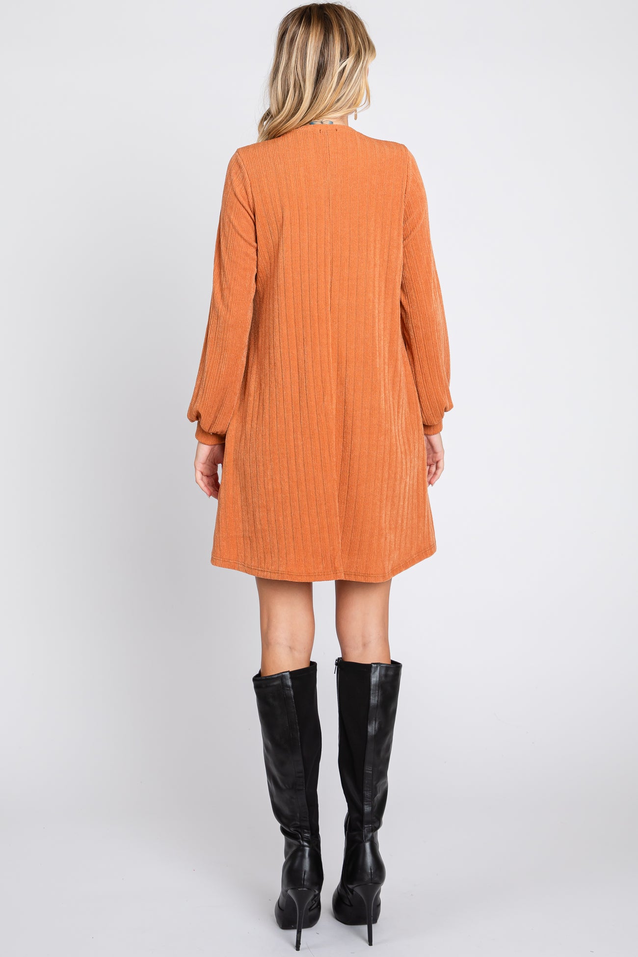 A knit dress featuring a mock neckline, long sleeves and an A-line skirt.
