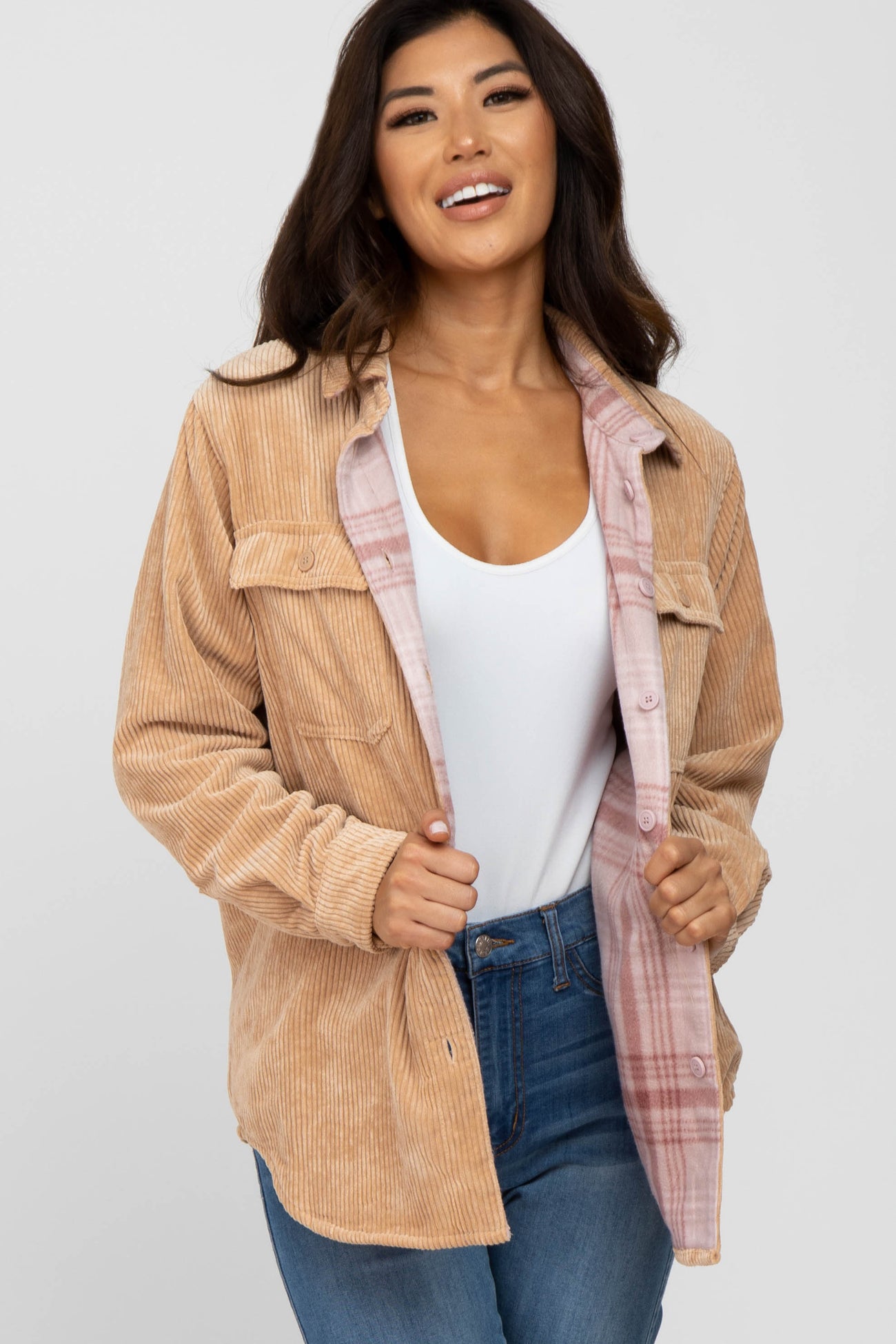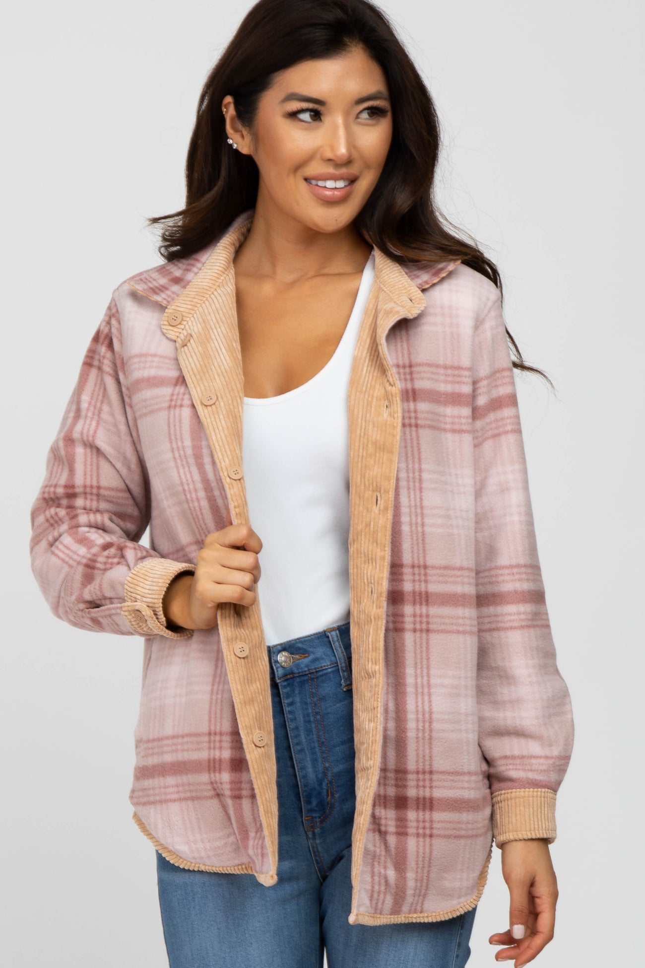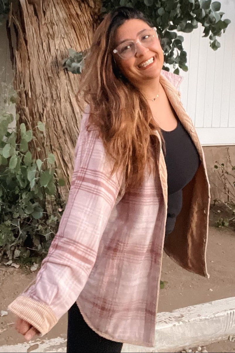 A reversible shirt jacket. Features solid ribbed velour side and fleece plaid side. Button closure. Two front pockets on solid side. Two side pockets on printed side.