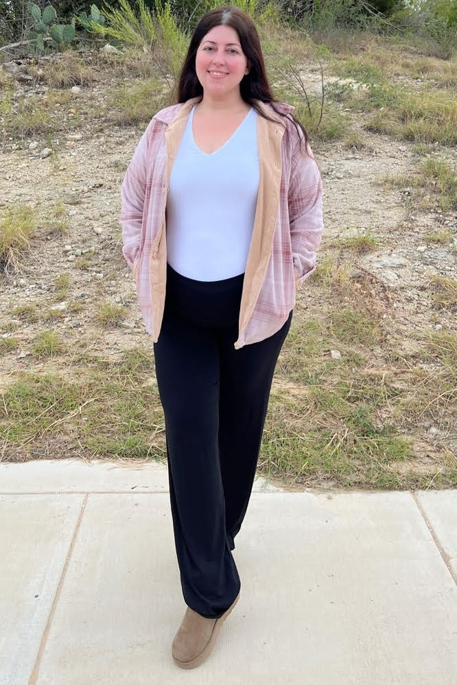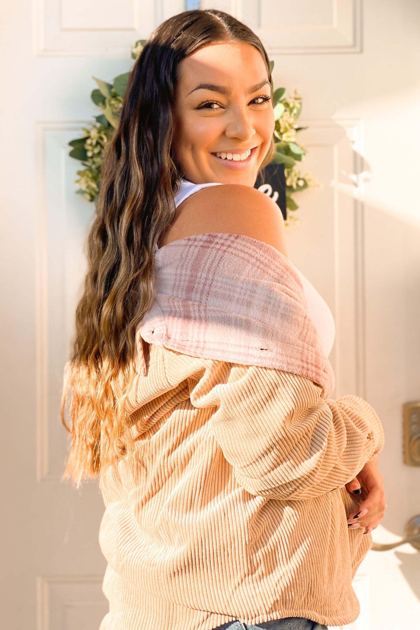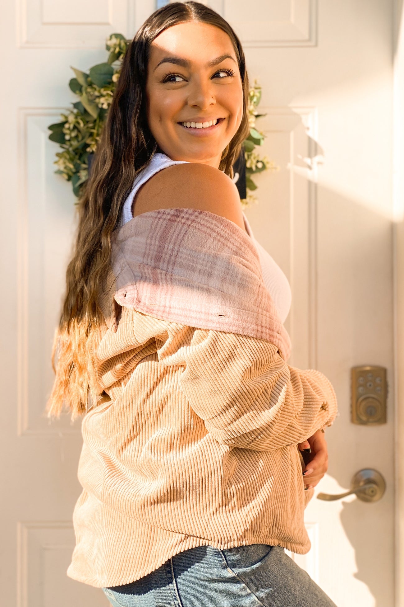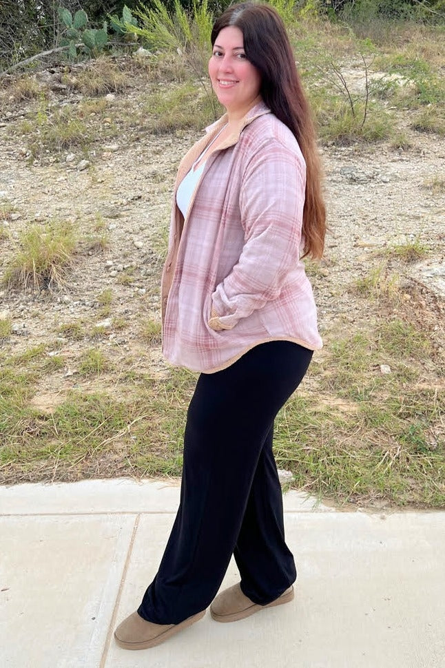 A reversible shirt jacket. Features solid ribbed velour side and fleece plaid side. Button closure. Two front pockets on solid side. Two side pockets on printed side.