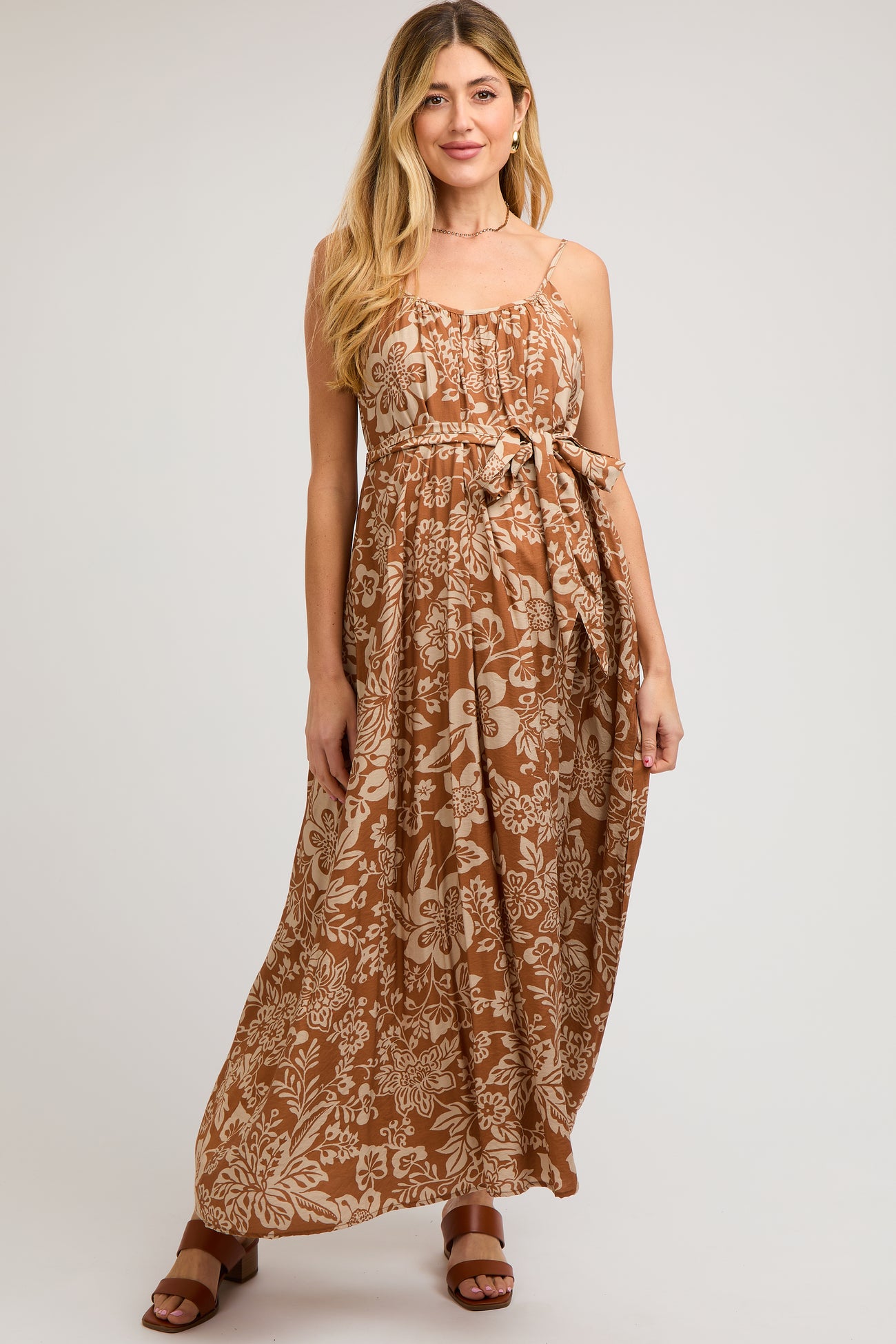 Camel Sleeveless Tie Waist Maternity Midi Dress