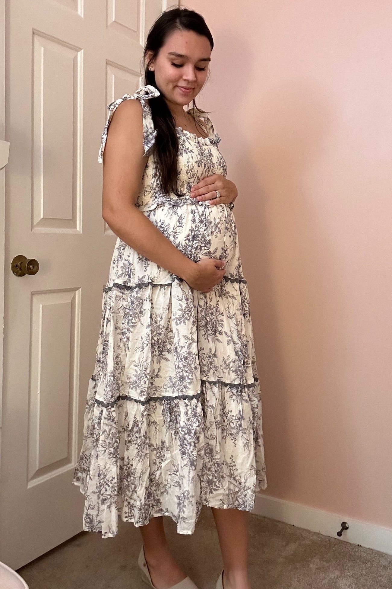 A floral sleeveless maternity midi dress featuring knotted shoulder straps, a smocked top, side pockets, a tiered skirt and a square neckline.