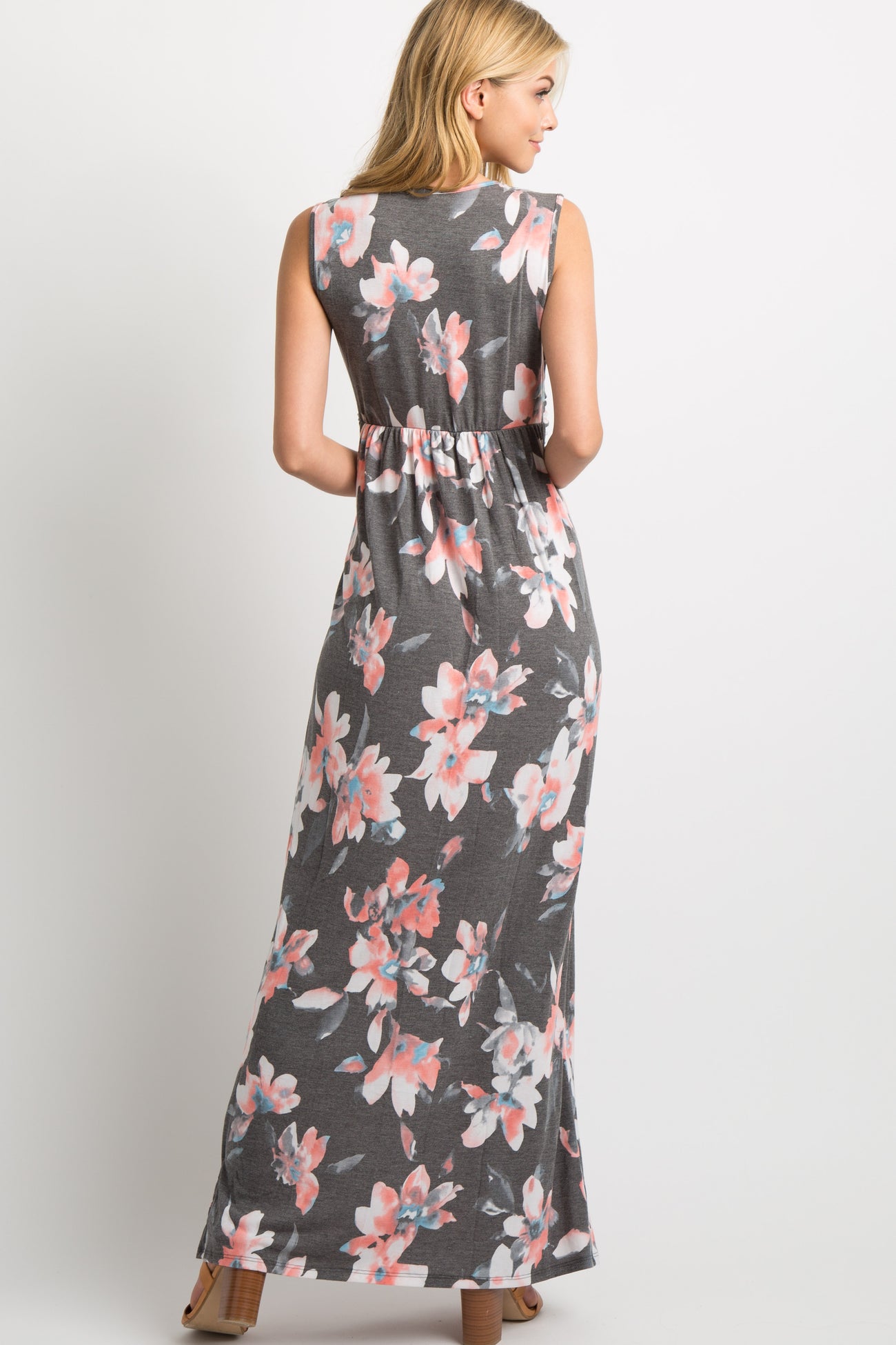 Charcoal Grey Floral Sleeveless Knot Front Maxi Dress