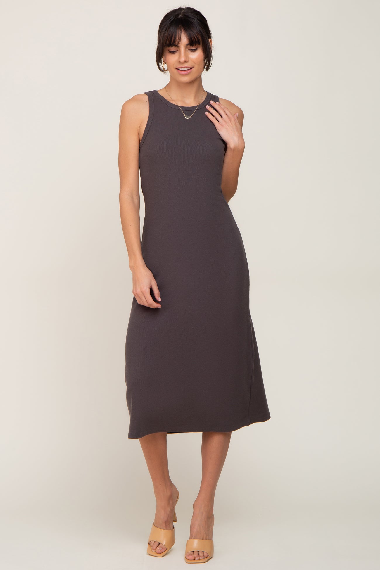 Charcoal Ribbed Sleeveless A-Line Midi Dress