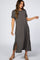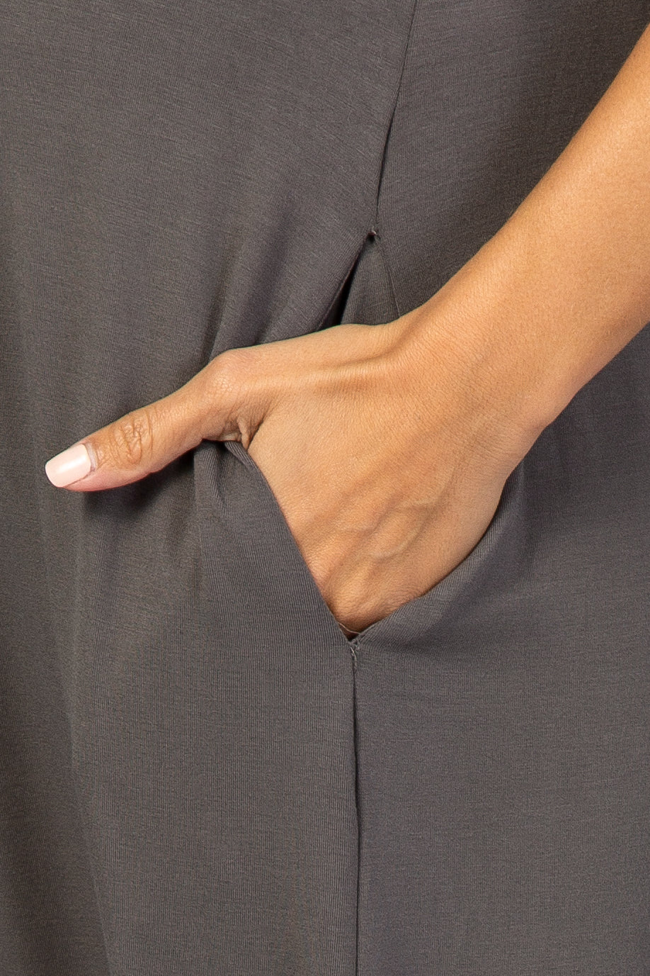 A solid hued maternity midi dress featuring short sleeves, side pockets and side slits.
