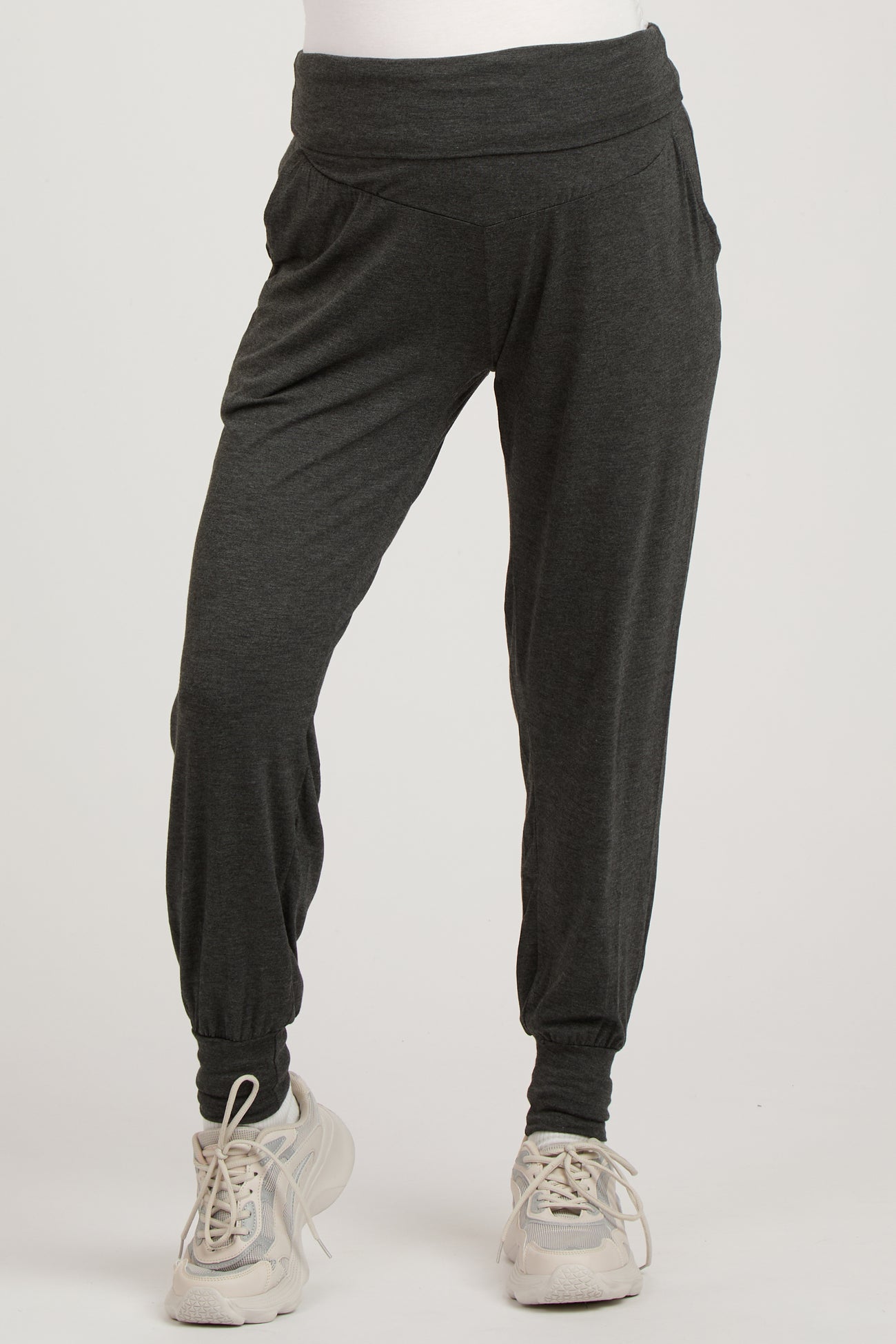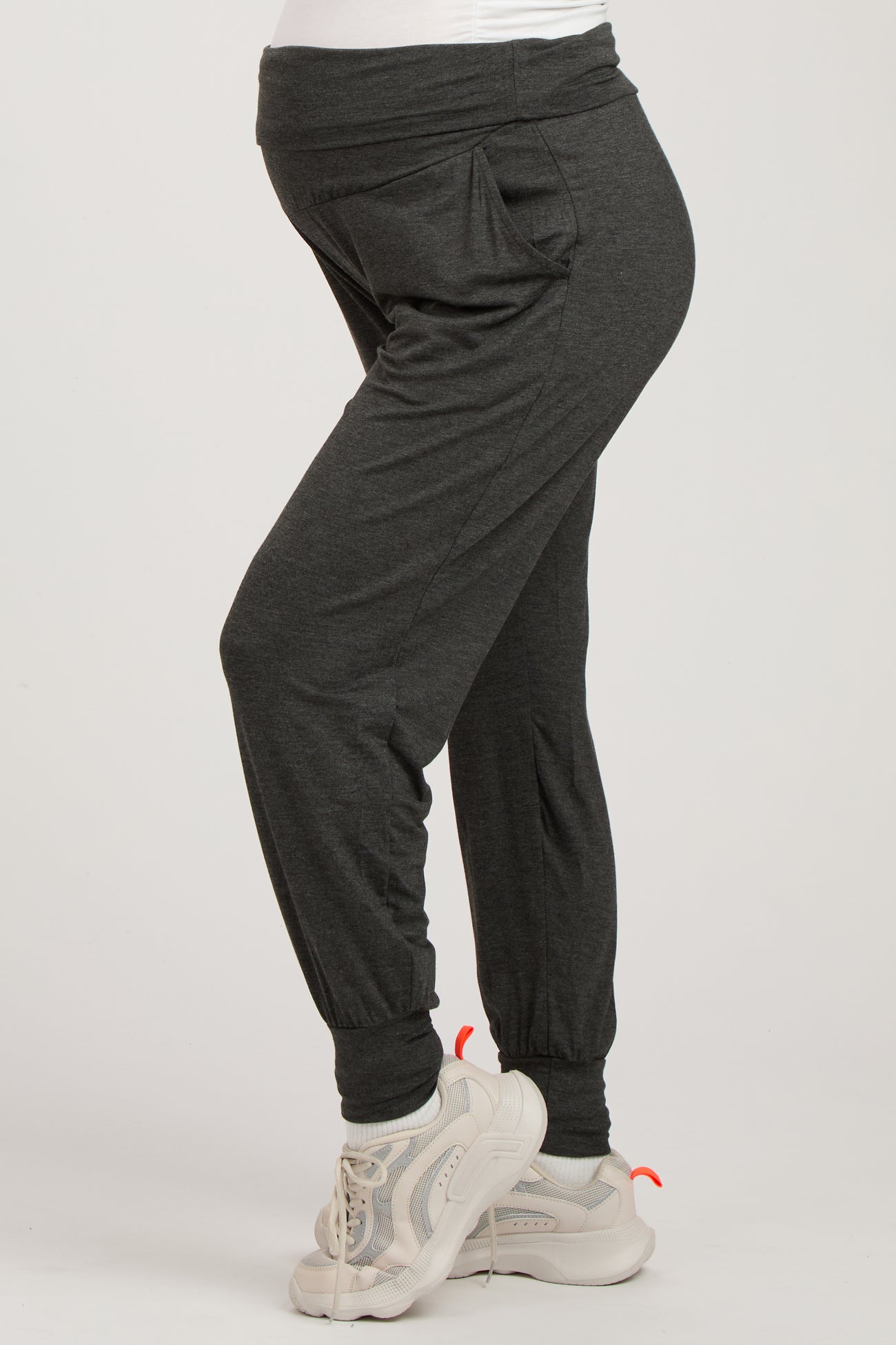 A pair of soft maternity joggers featuring a wide belly band and side pockets.