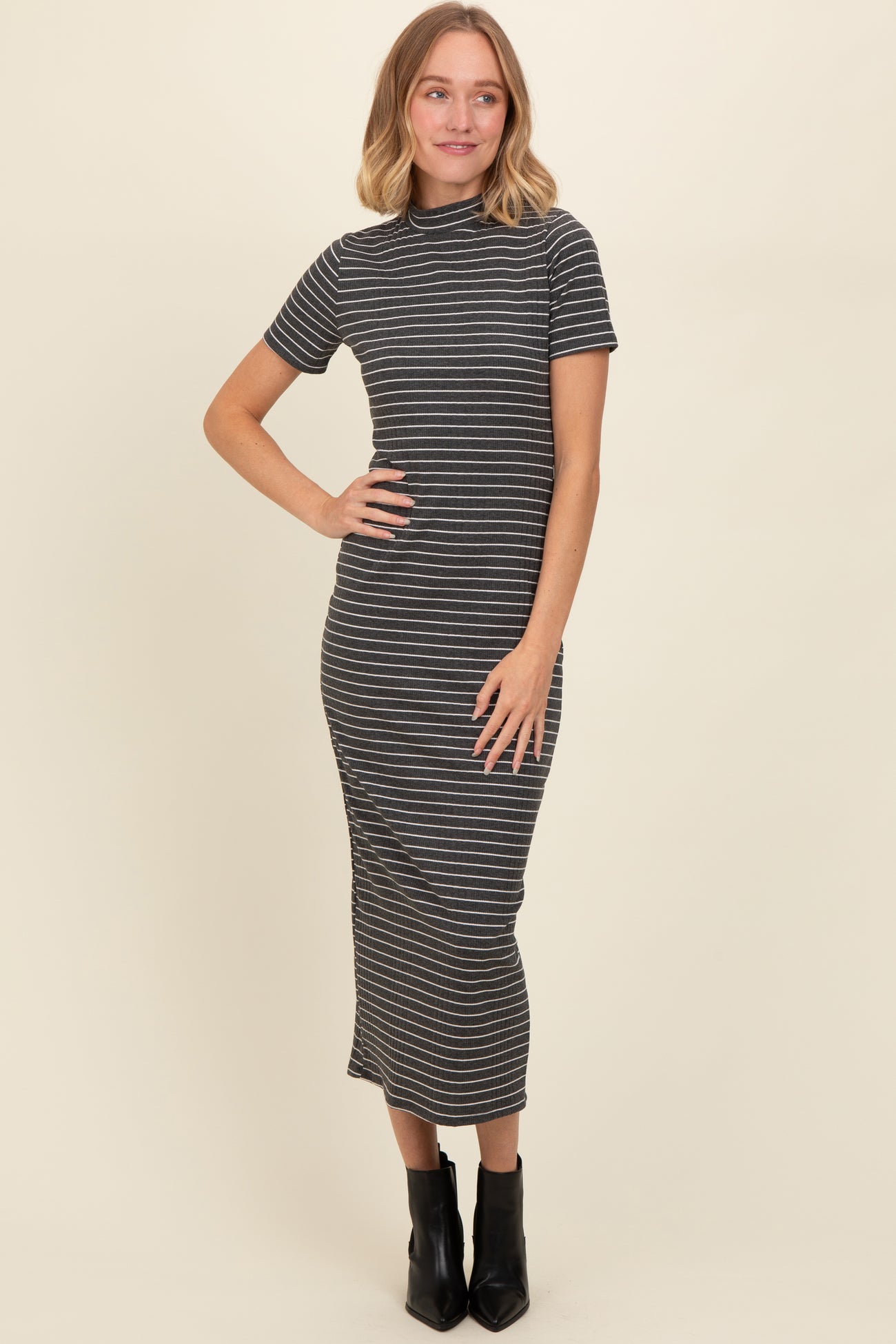 Charcoal Striped Mock Neck Fitted Maternity Midi Dress
