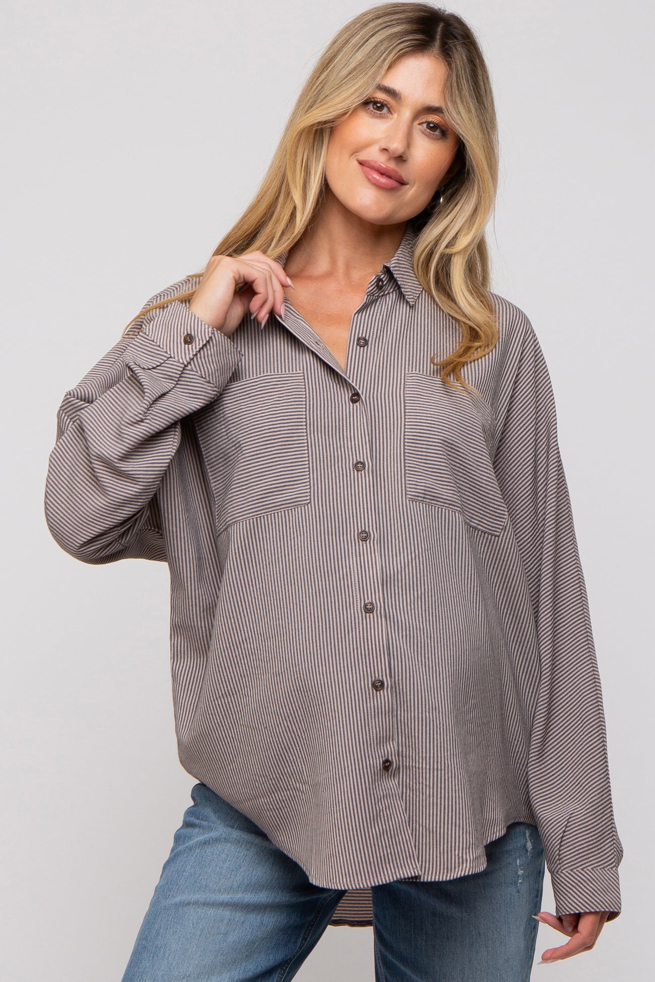 A striped maternity top featuring a collared neckline, a button front, two front pockets and a rounded hem.