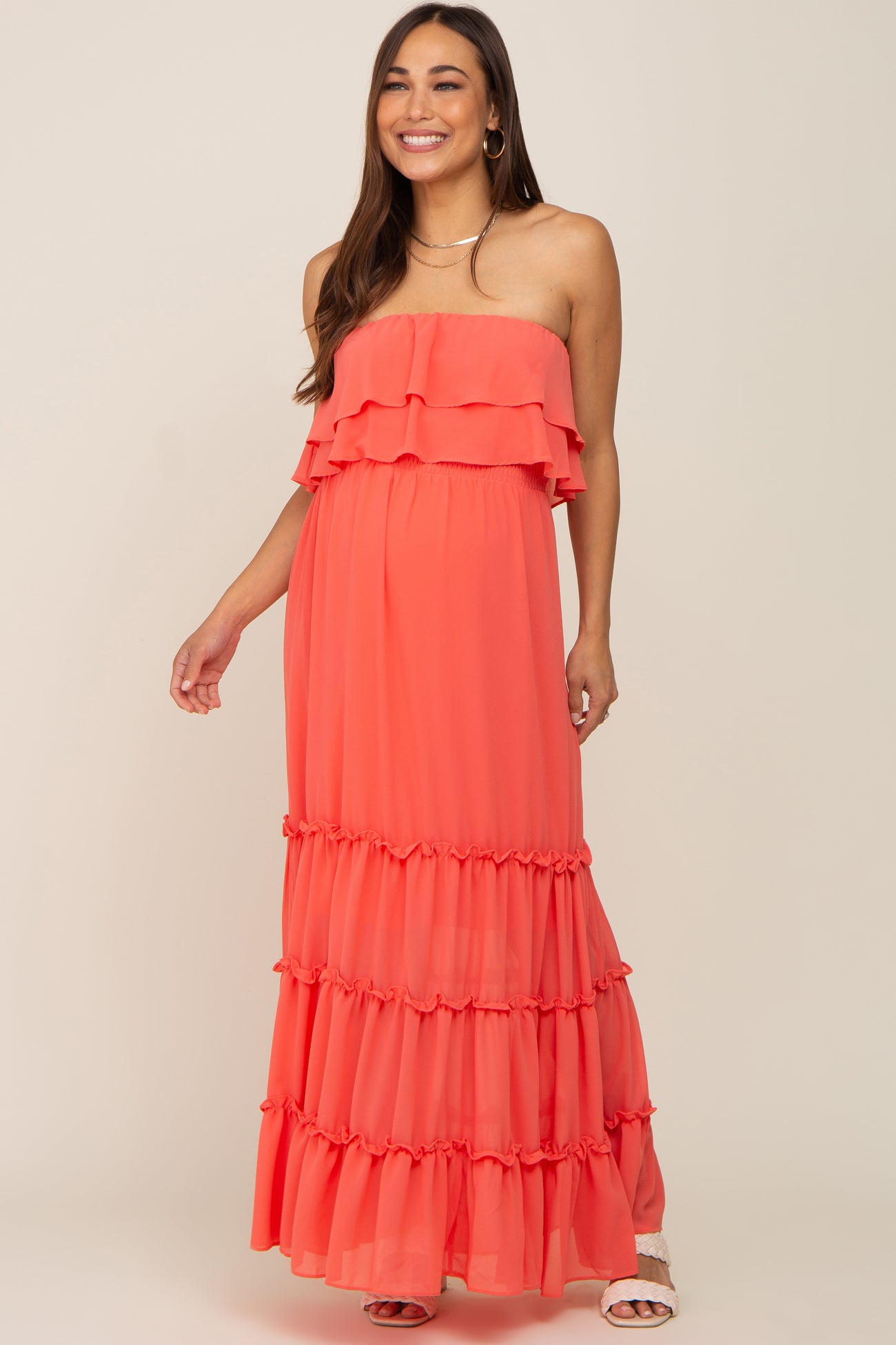 Coral Chiffon Strapless Ruffle Tiered Maternity Maxi Dress