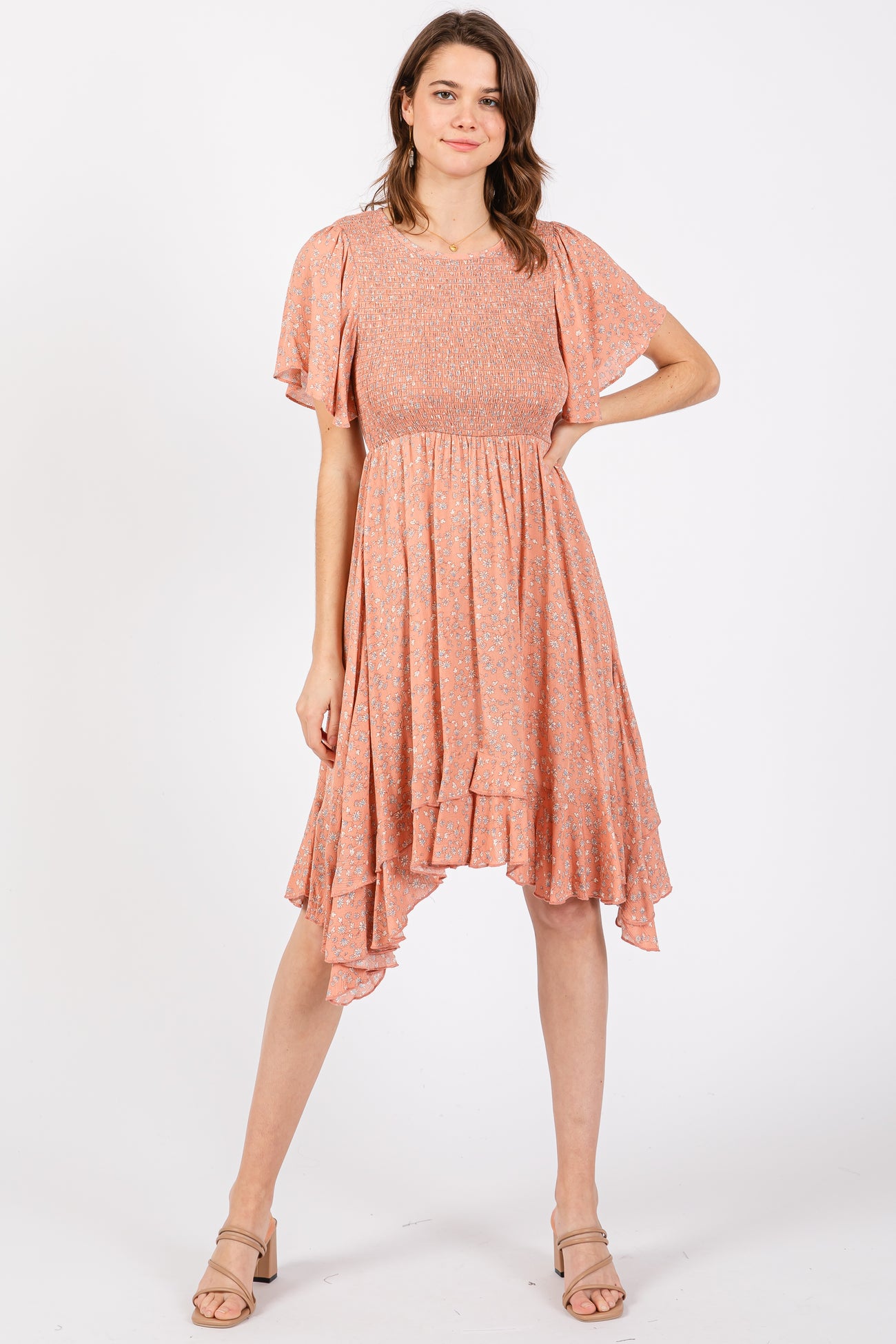 A floral maternity dress featuring a smocked top, short sleeves, a ruffle hem, a rounded neckline and a back keyhole cutout with a self-tie closure.