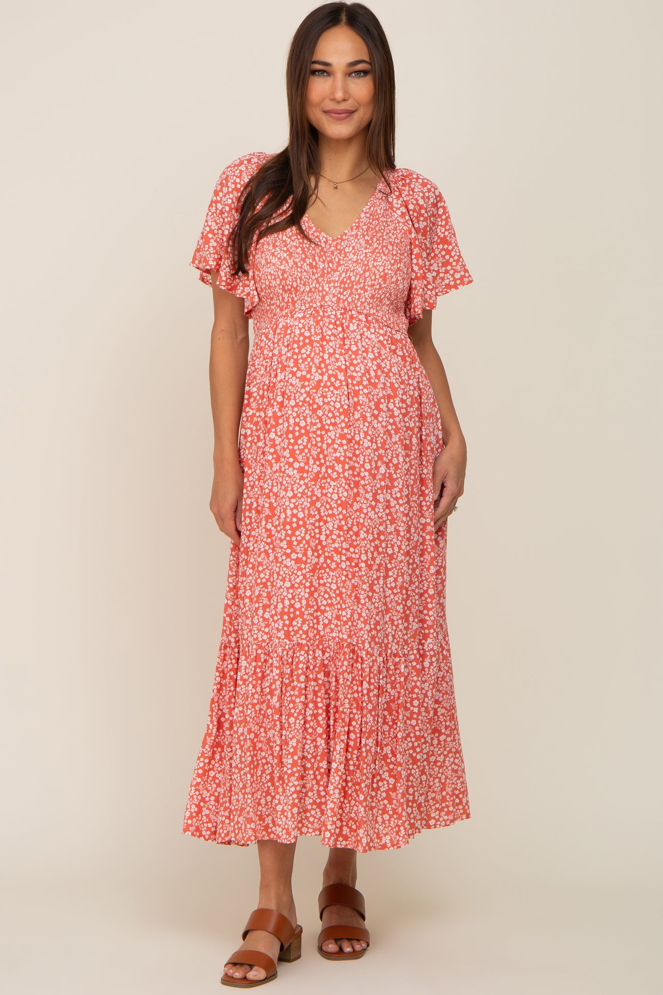 Coral Floral Smocked V-Neck Flutter Short Sleeve Maternity Midi Dress