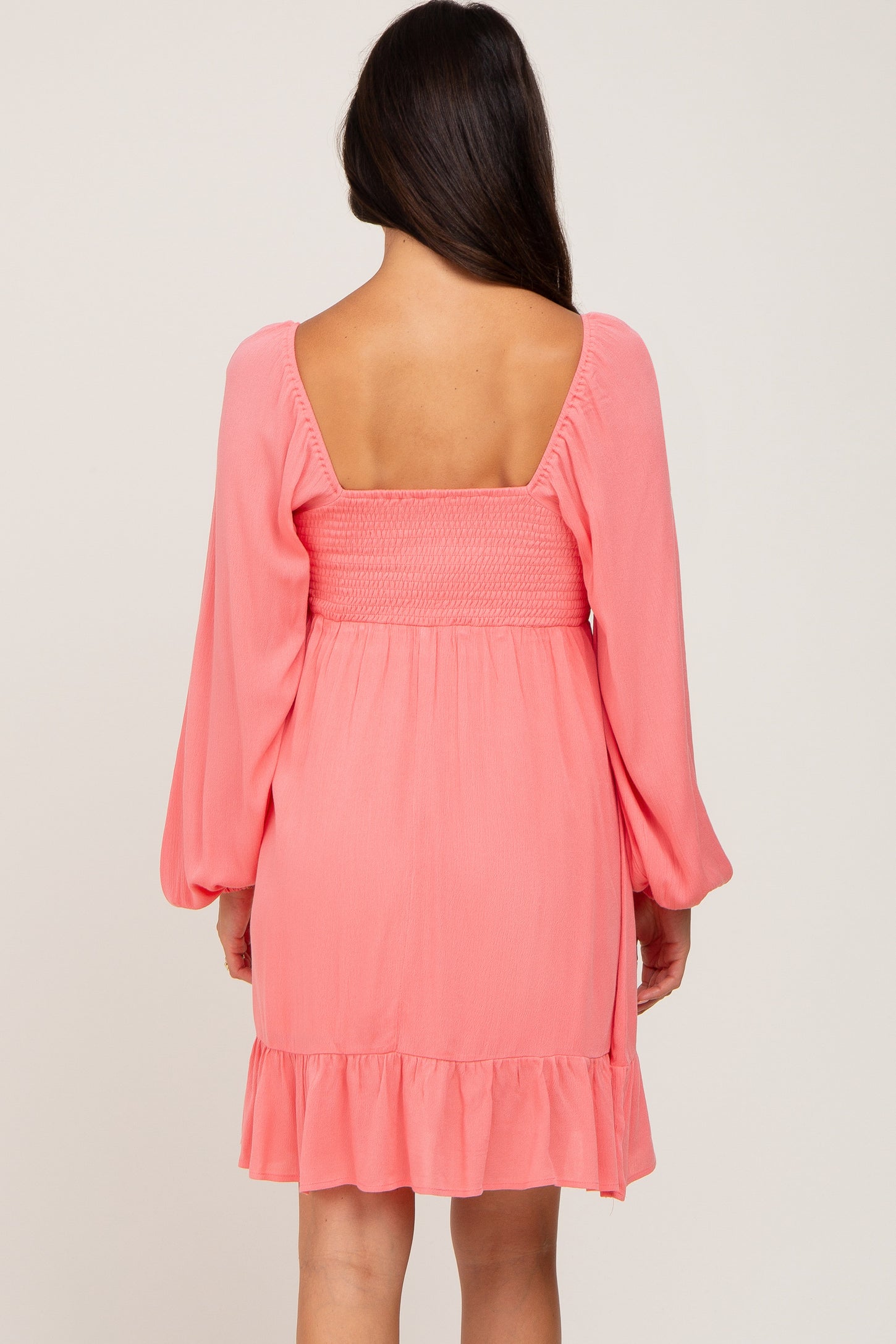 A solid hued dress featuring a square neckline, long puff sleeves, a smocked elastic back, a ruffle hem and a double lined skirt.