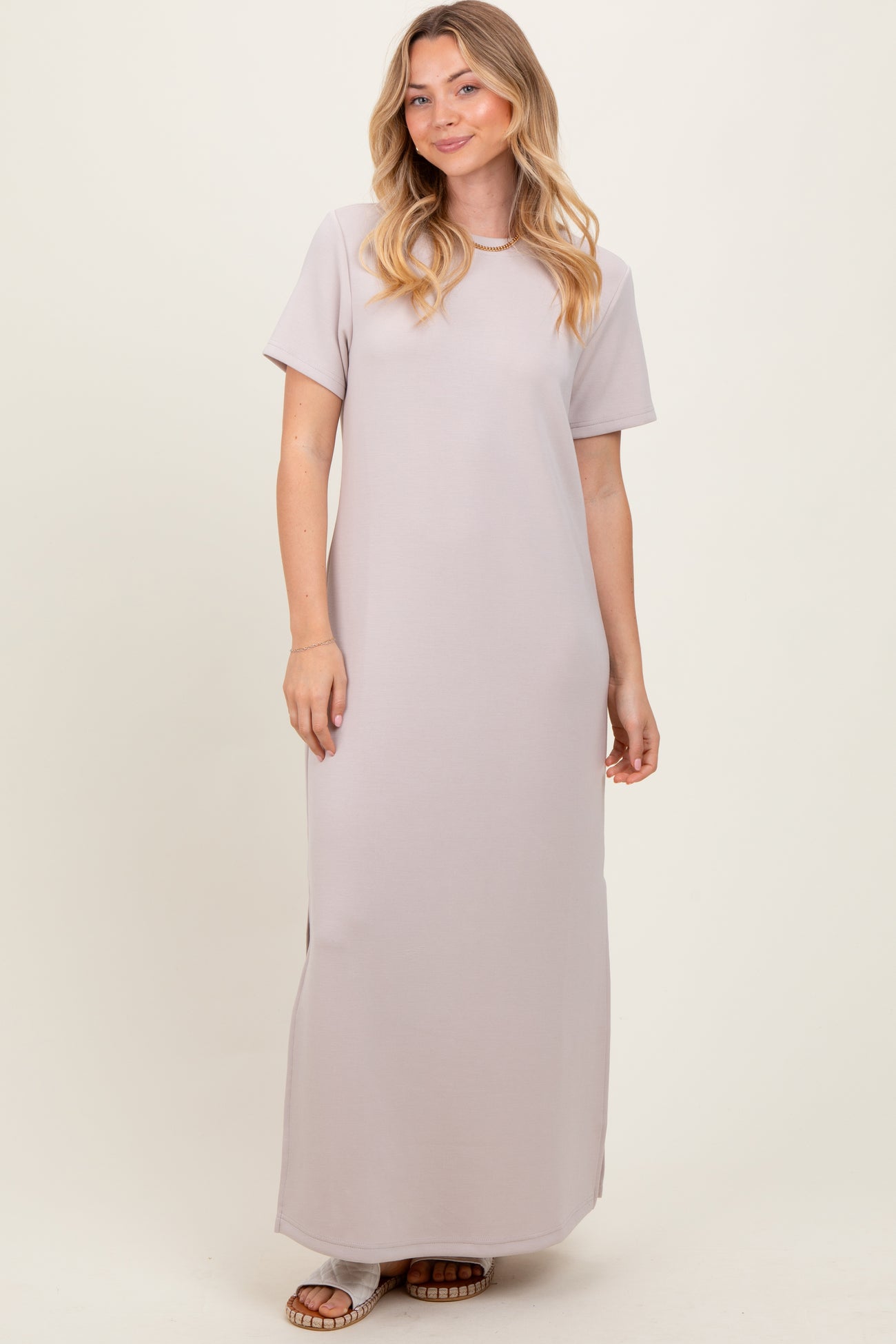 Cream Basic Side Slit Short Sleeve Midi Dress