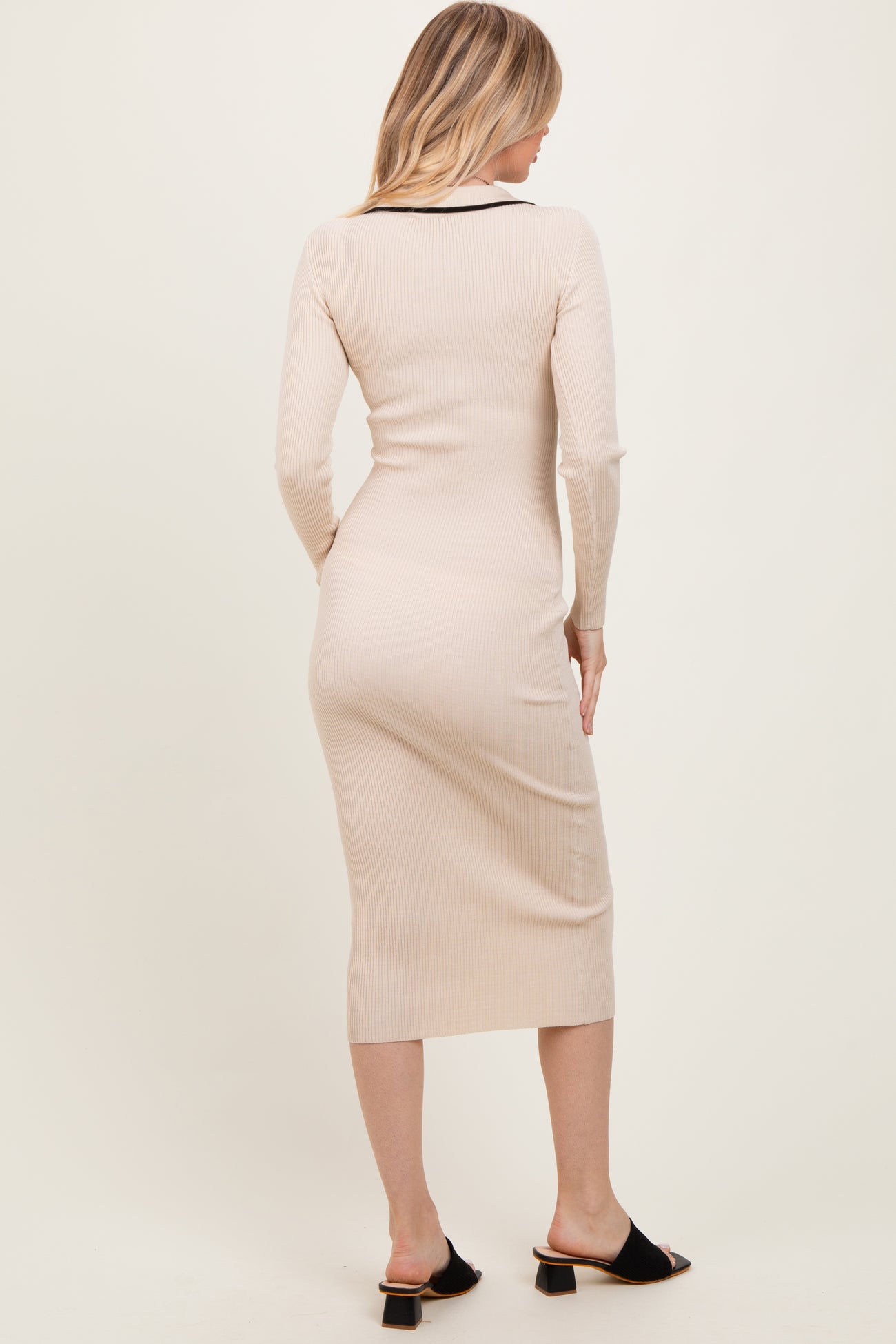 Cream Contrast Trim Ribbed Knit Button Up Midi Dress