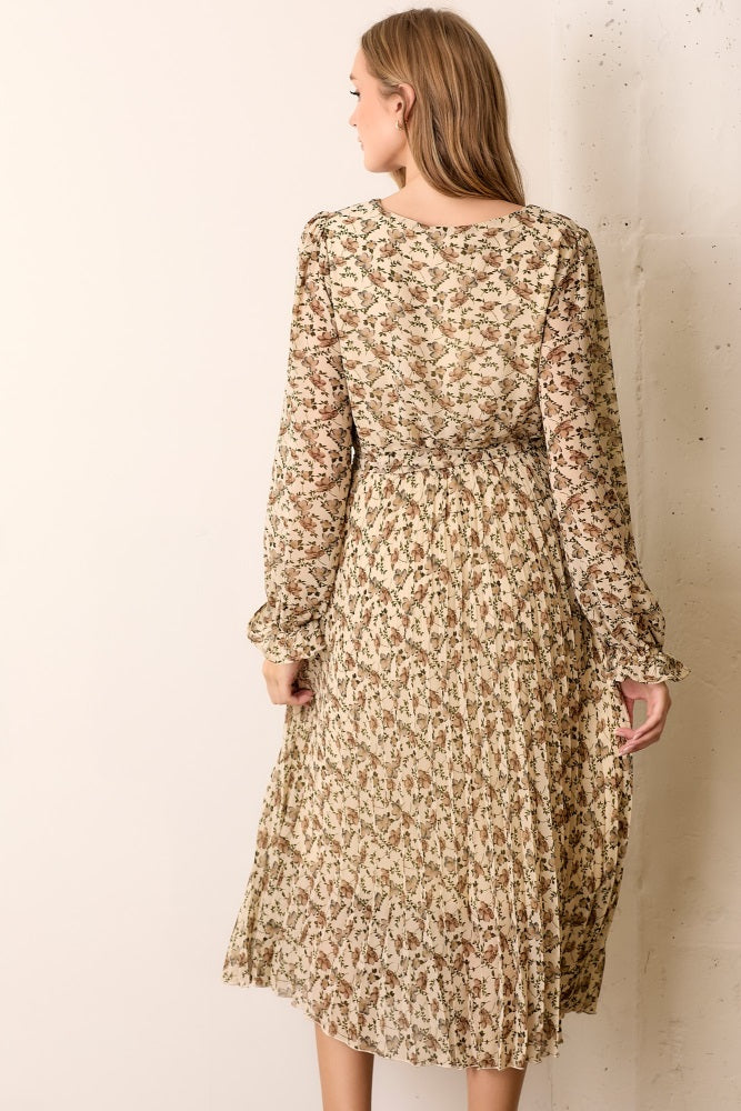 Cream Floral Chiffon Long Sleeve Pleated Midi Dress
