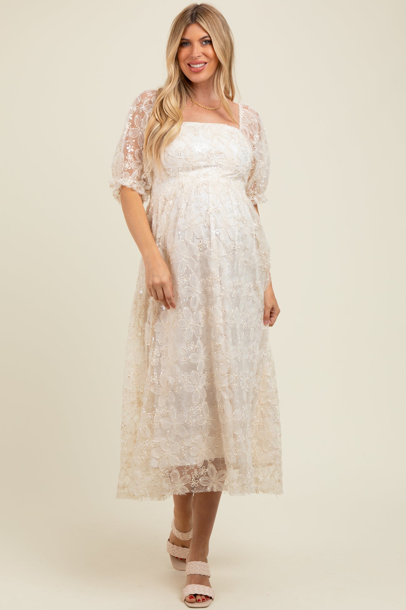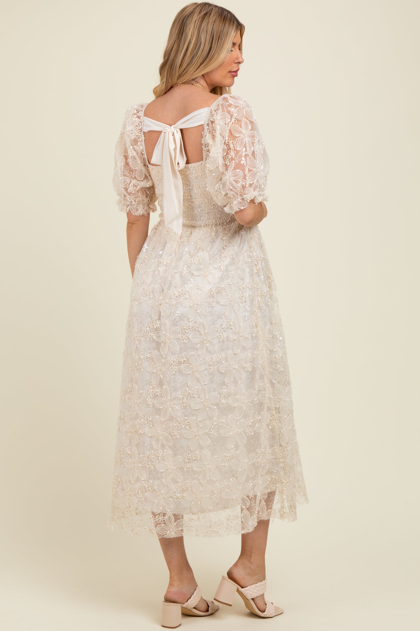 Cream Floral Mesh Overlay Tie Back Maternity Midi Dress