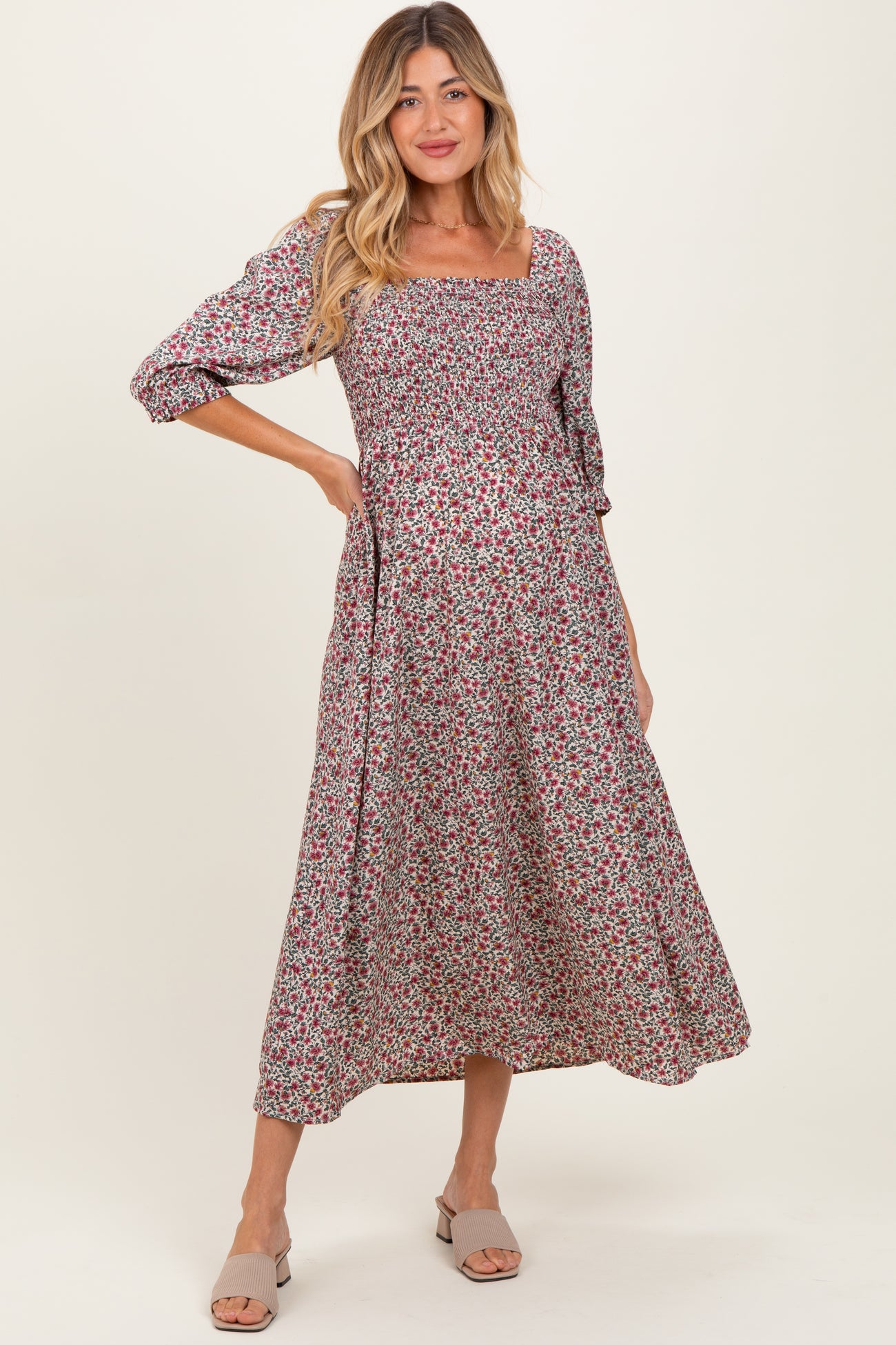 Cream Floral Print Smocked Bodice Maternity Maxi Dress