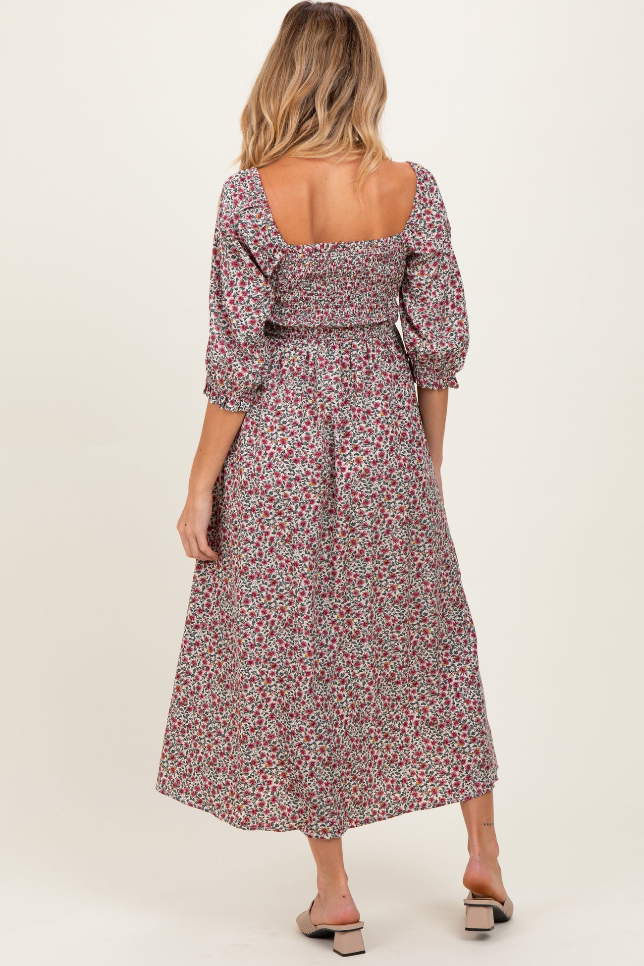 Embrace effortless style and comfort with our Cream Floral Print Smocked Bodice Maternity Maxi Dress. Designed exclusively for expectant moms, this dress features a stretchy smocked bodice that perfectly accommodates your growing bump while providing a flattering fit. The delicate floral print on a soft cream background adds a touch of feminine charm, making it ideal for casual outings or special occasions. With three-quarter puff sleeves and a flowy maxi skirt, this dress ensures breathability and ease of movement. Pair it with your favorite sandals or heels for a chic, comfortable maternity look all season long.