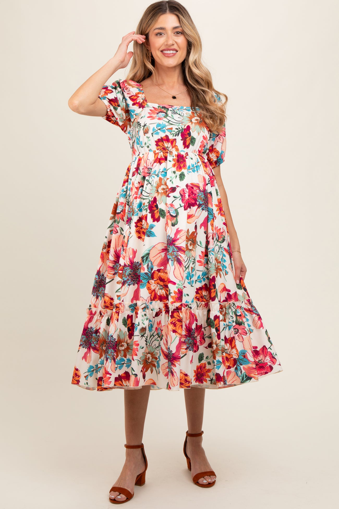 Cream Floral Puff Sleeve Maternity Midi Dress