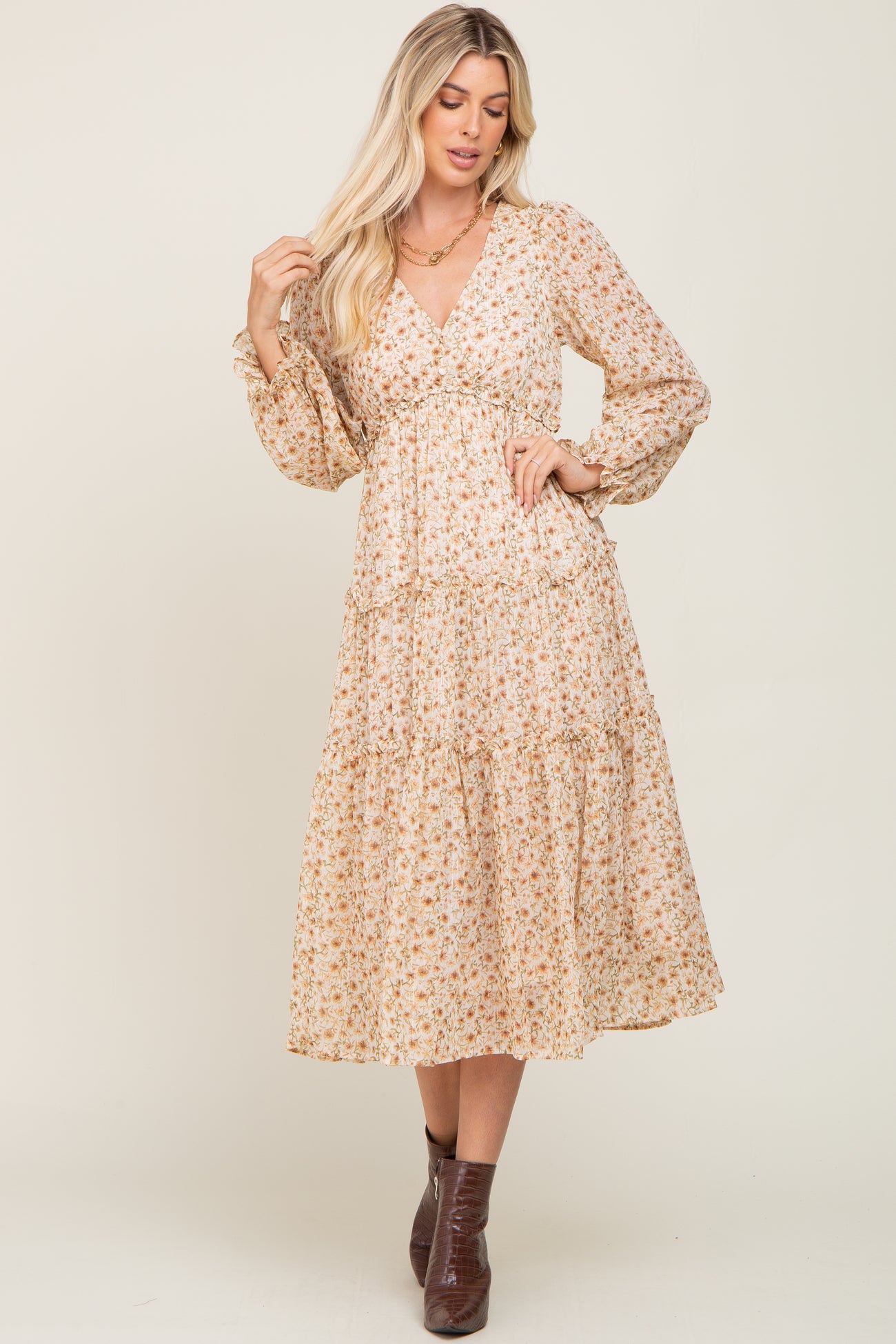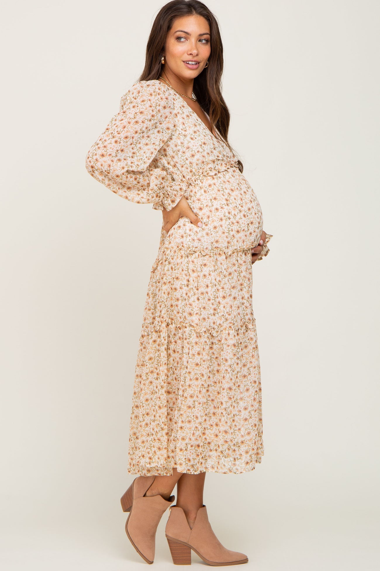 Cream Floral Ruffle Tiered Maternity Midi Dress