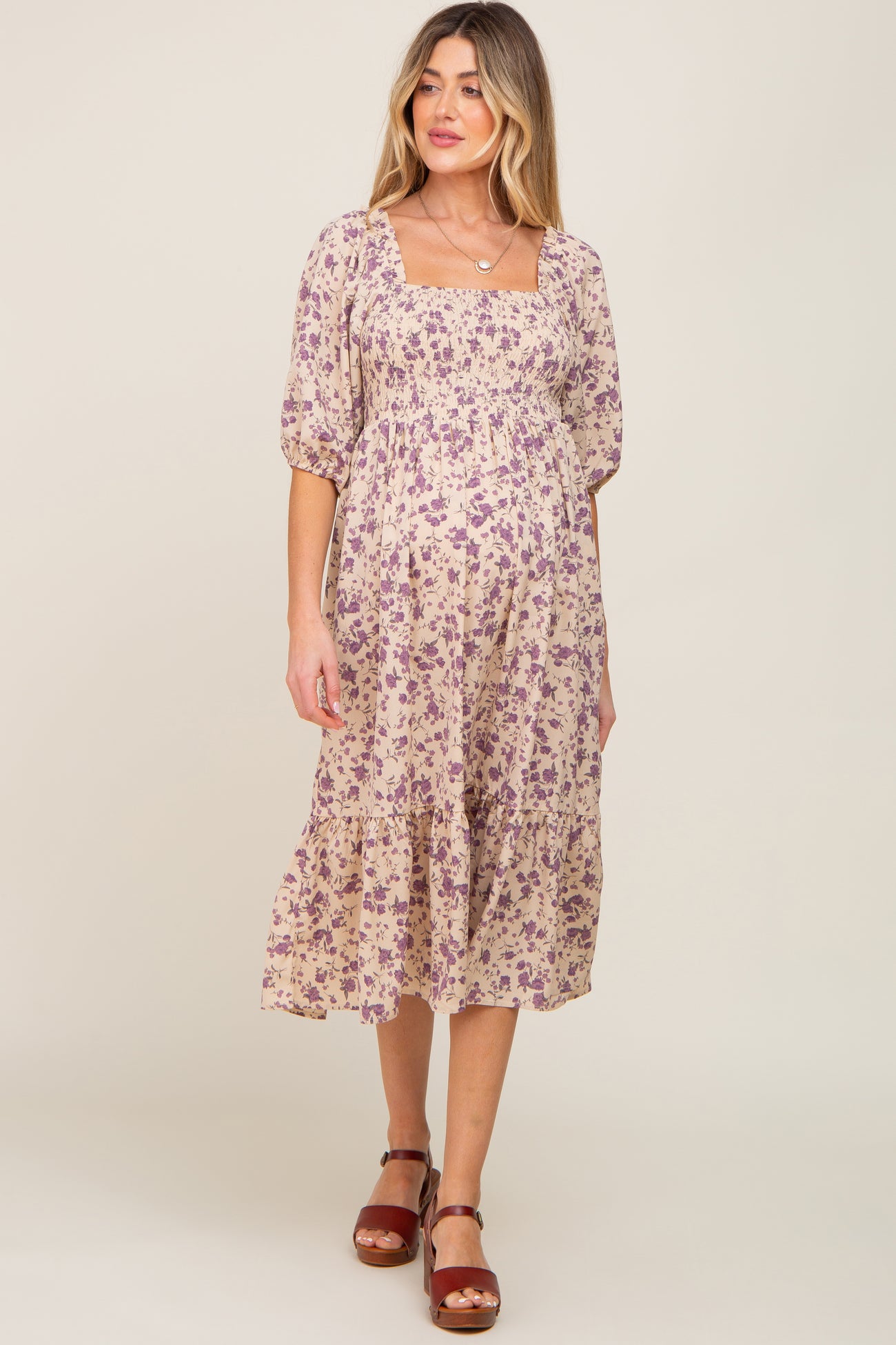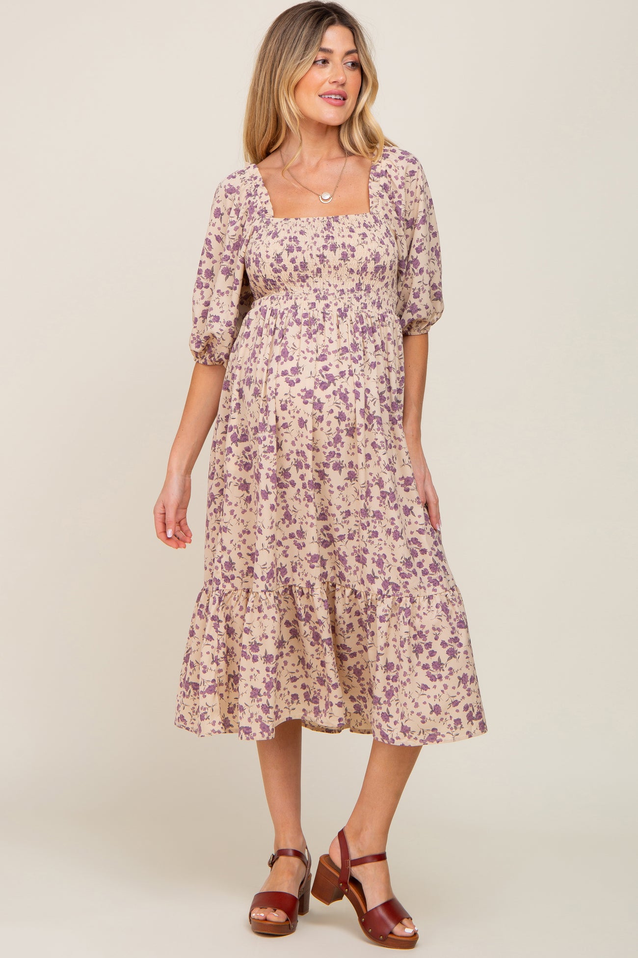 A floral print maternity midi dress featuring short sleeves, a smoked top, a ruffle hem, side pockets and a square neckline.
