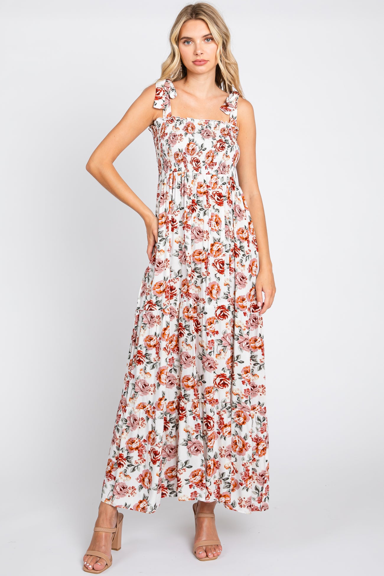 Cream Floral Smocked Shoulder Tie Tiered Maxi Dress