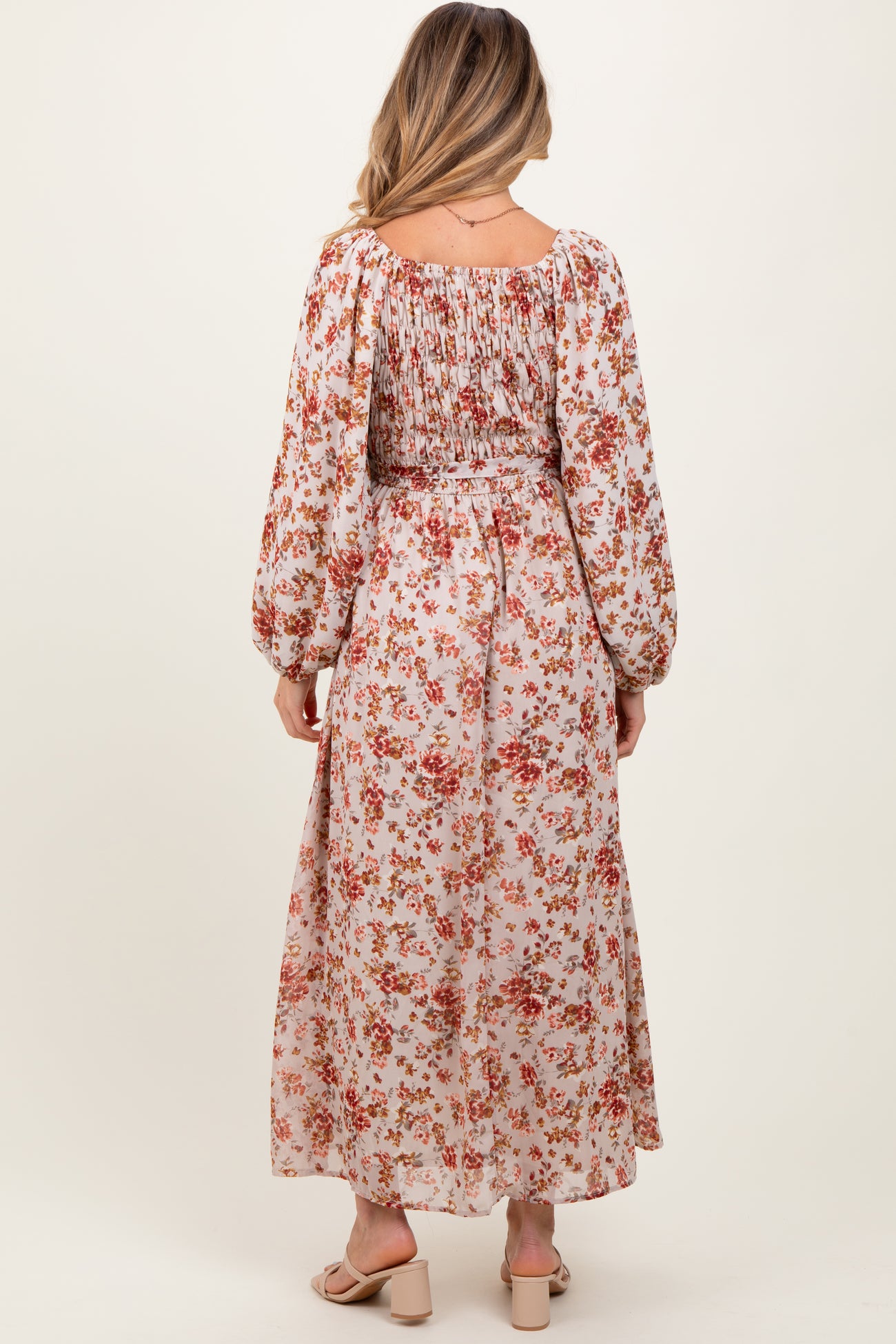 Cream Floral Square Neck Front Tie Maternity Midi Dress