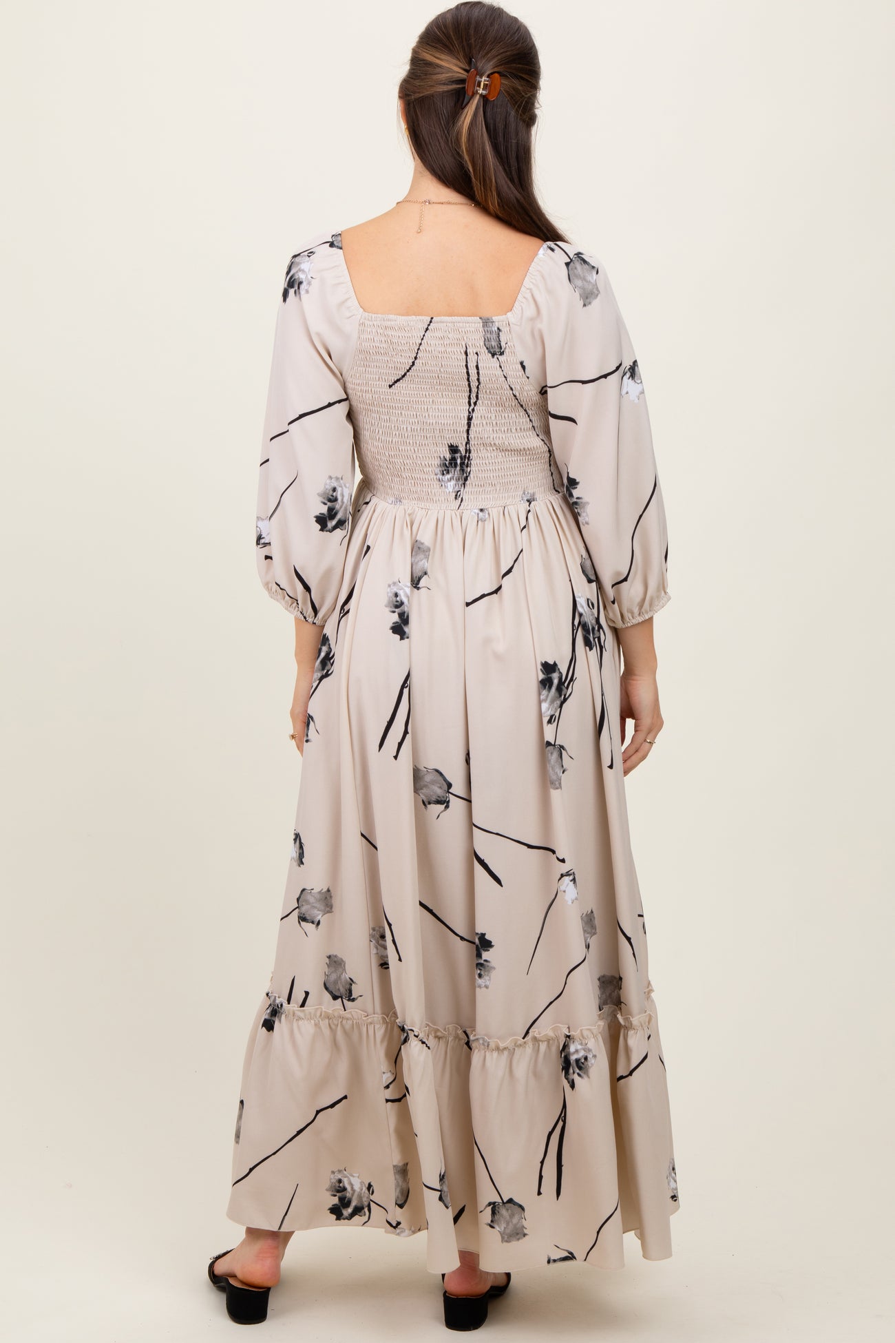 Embrace elegance and comfort with our Cream Floral Square Neck Maternity Midi Dress. Crafted from lightweight, breathable fabric, this dress features a flattering square neckline and gentle puff sleeves that gather at the wrists for a delicate finish. The flowing midi length with soft ruffle details offers a graceful silhouette that accommodates your growing bump. Adorned with a subtle black and gray floral print on a creamy background, it's perfect for both casual outings and special occasions. Easy to wear and style, this dress combines timeless charm with maternity-friendly design, making it a must-have addition to your wardrobe.