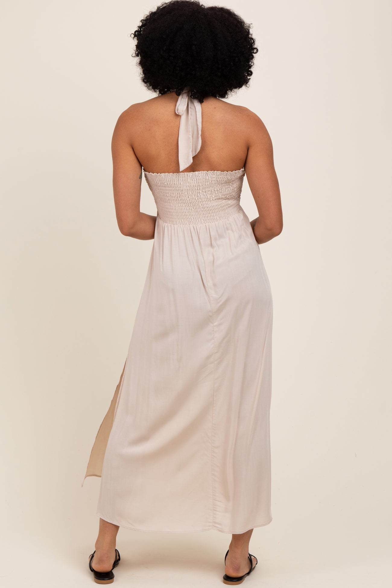 Step into effortless elegance with our Cream Halter Neck Side Slit Midi Dress. Crafted from silky, lightweight fabric, this dress features a flattering halter neckline that highlights your shoulders and a graceful side slit for added movement and allure. The gathered bust detail enhances femininity, while the flowy midi length offers a versatile silhouette perfect for day or night. Whether you're attending a summer brunch or a casual evening out, this dress combines comfort and style flawlessly. Pair with sandals or heels and make a chic statement wherever you go. Embrace timeless sophistication today!