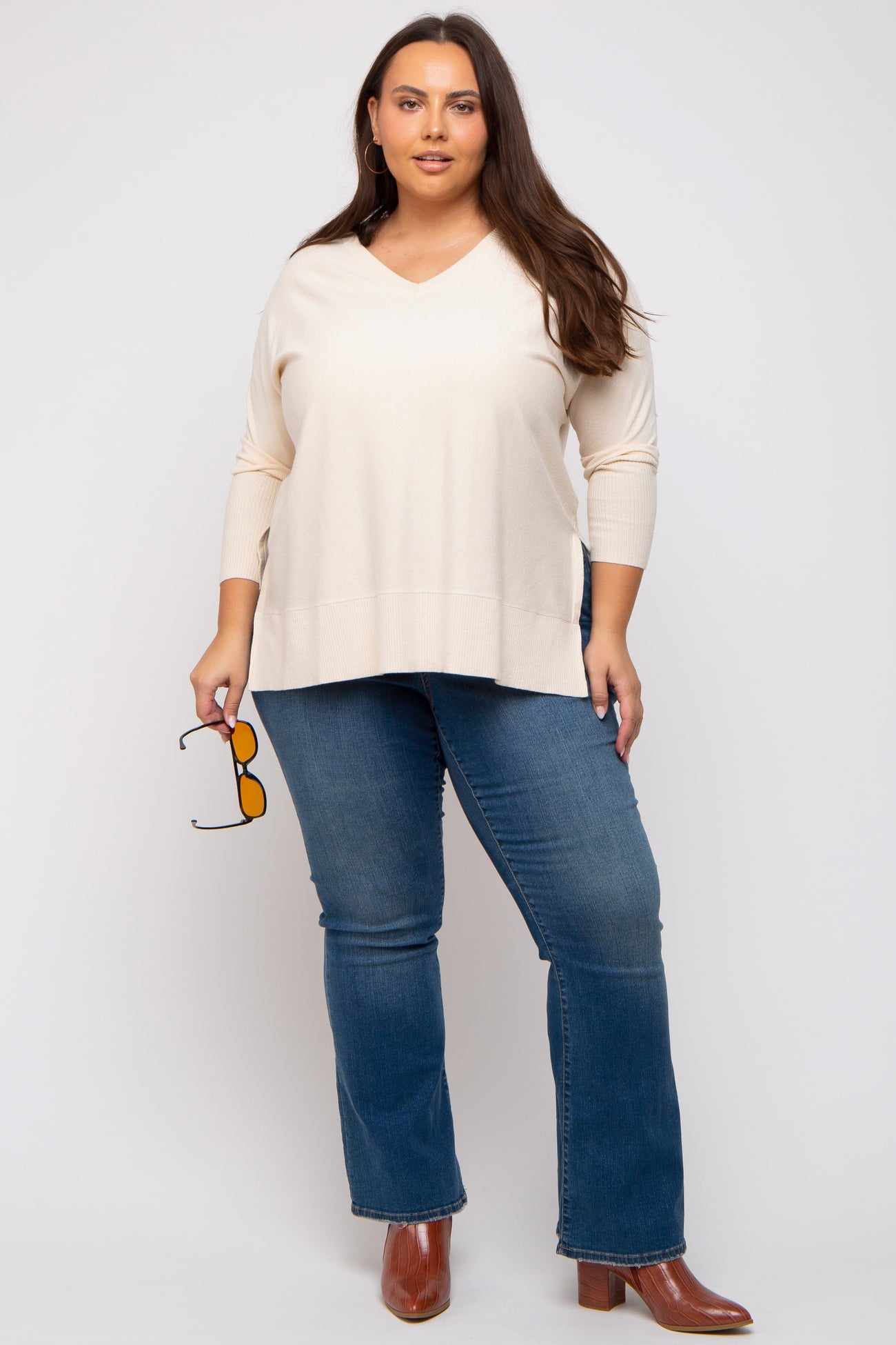 Details A solid hued knit plus maternity top featuring long dolman sleeves, side slits and a v-neckline. Content + Care