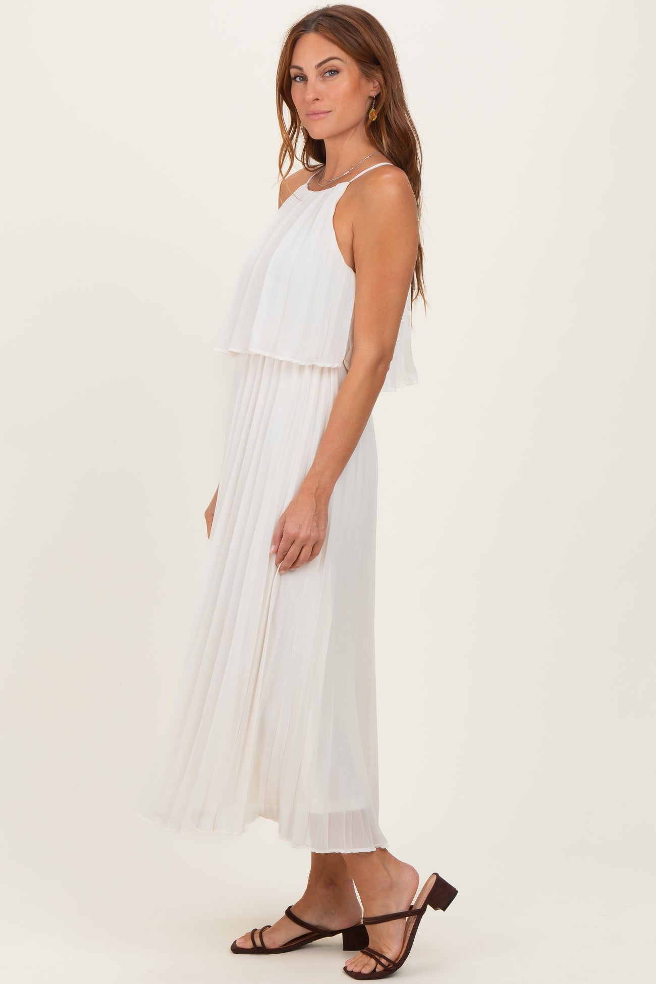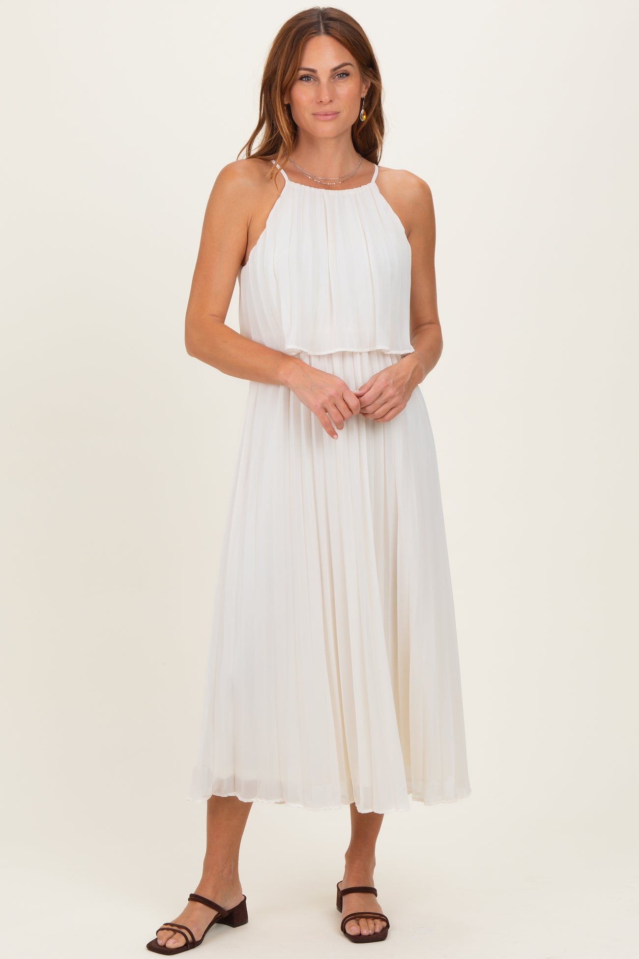 Cream Pleated Woven Midi Dress