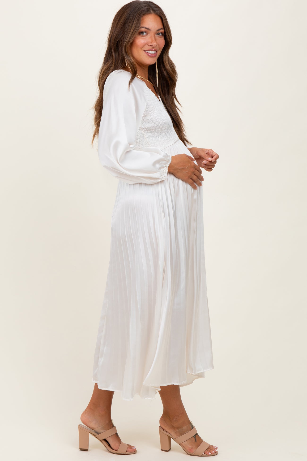 Cream Satin Smocked Pleated Maternity Midi Dress