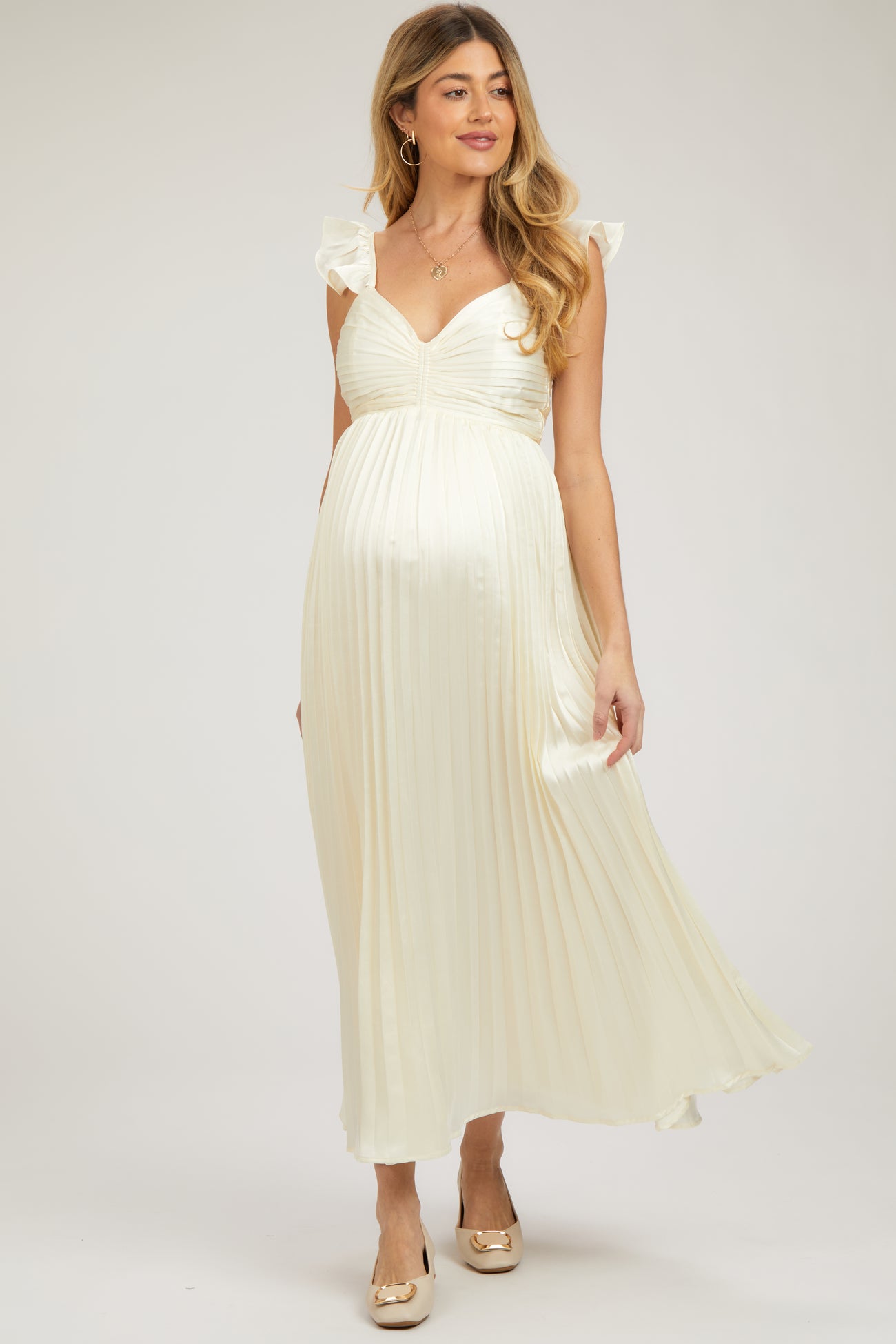 A solid hued maternity dress featuring adjustable ruffle shoulder straps, allover pleating, a back zipper closure and a sweetheart neckline.